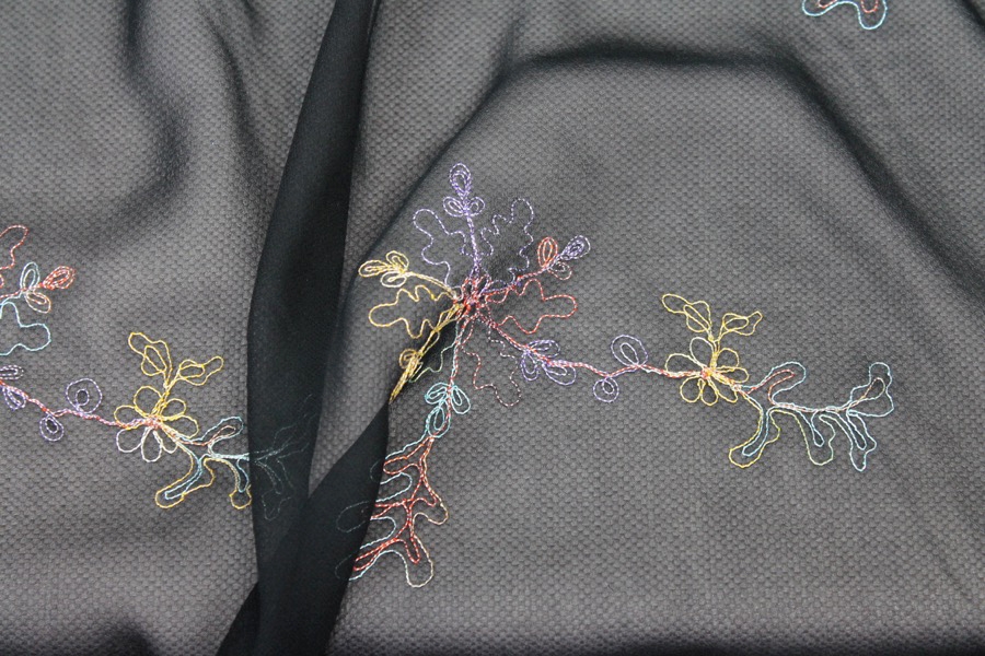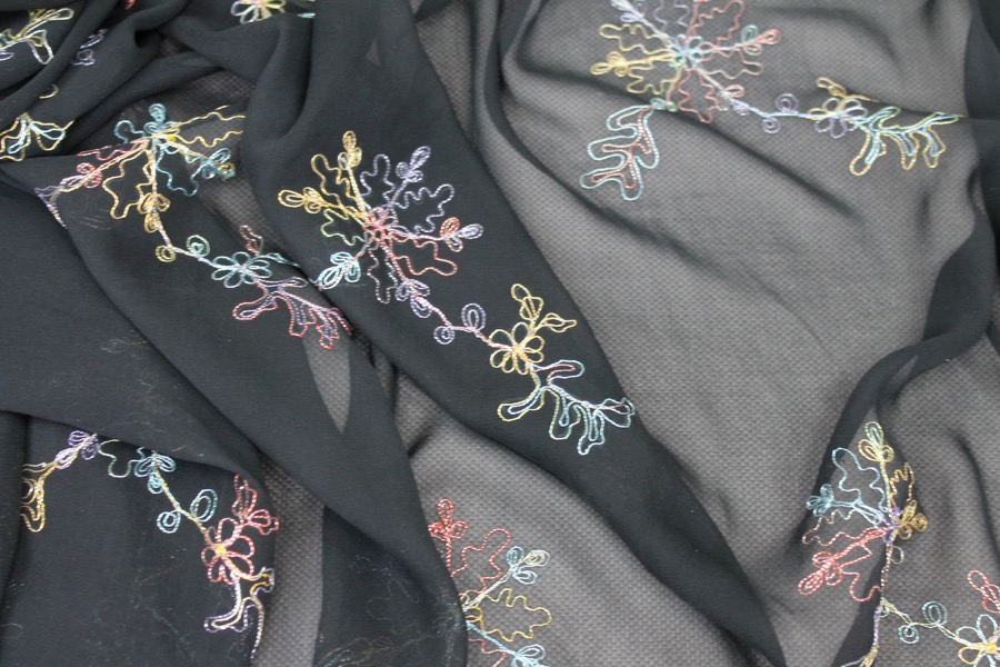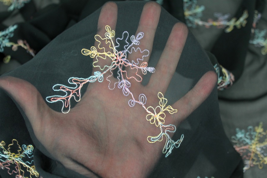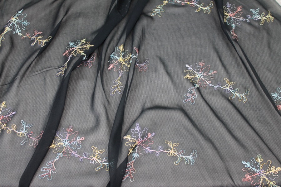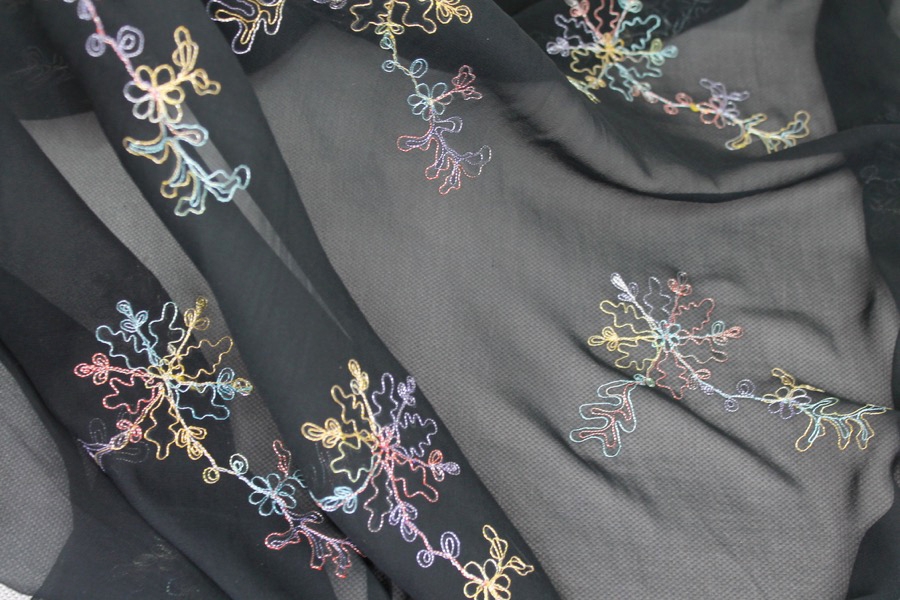 Black embroidered silk chiffon in floral pattern resembling snowflakes with a colour changing lurex thread.