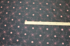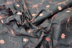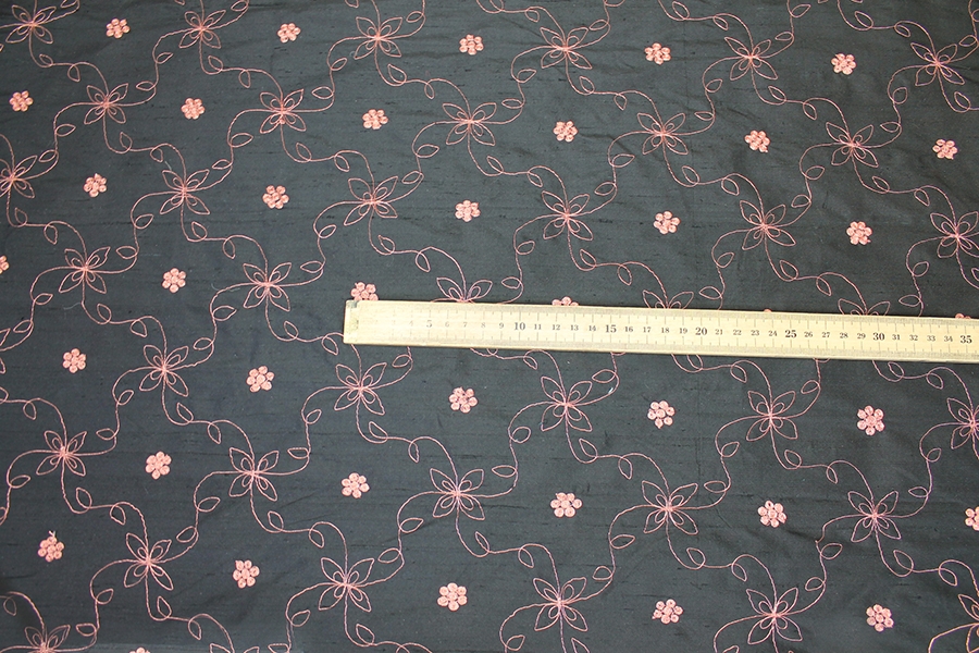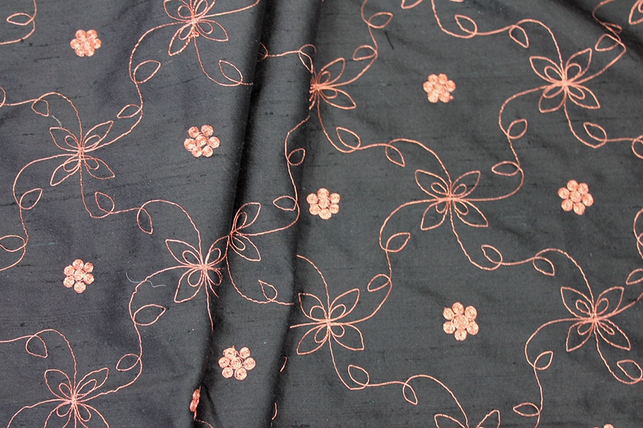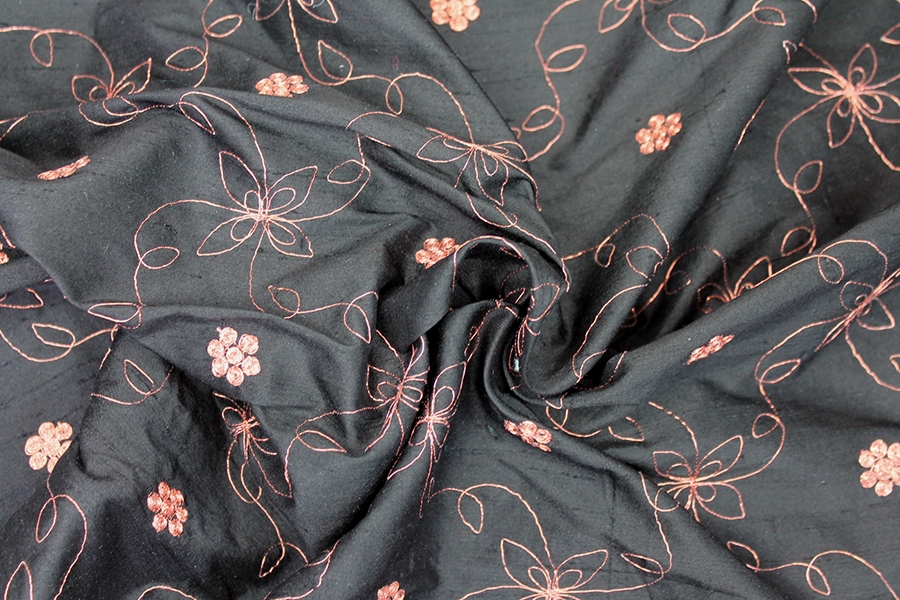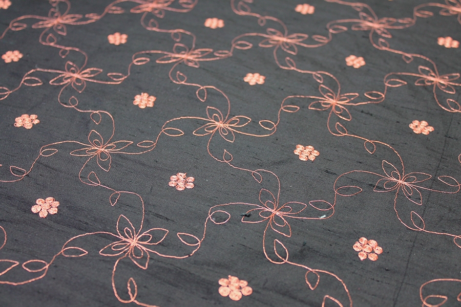 A beautifully structured cloth, woven with a traditional Indian silk yarn to give a slubbier finish when compared to other dupions. Black with a simplistic fine embroidery of florals and swirls in copper metallic thread. 100% silk.