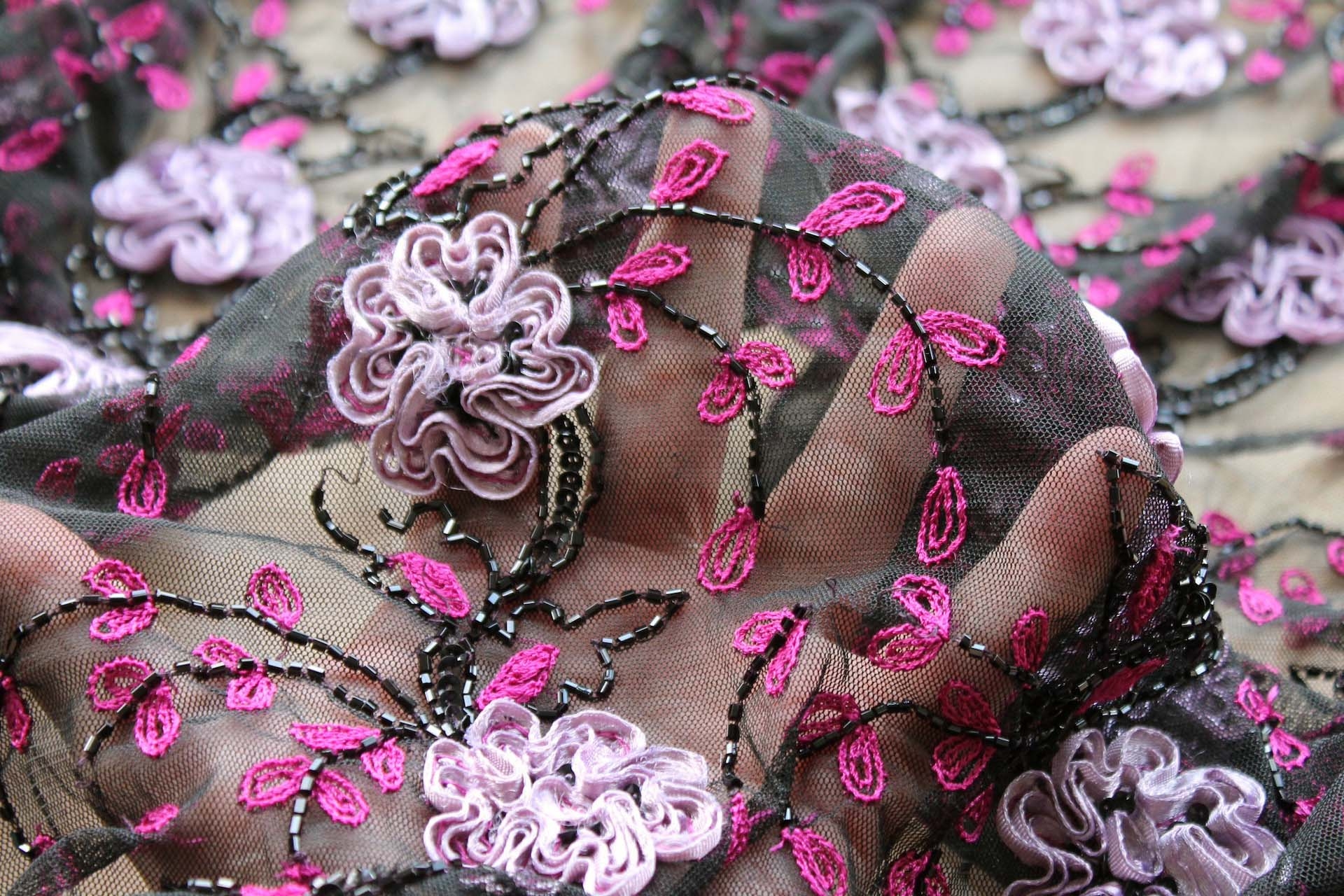 Black tulle with pale lilac ribbon embroidered flowers, bright pink embroidered leaves and black sequins and bugle beads.