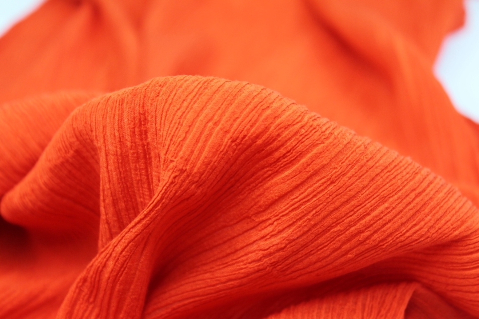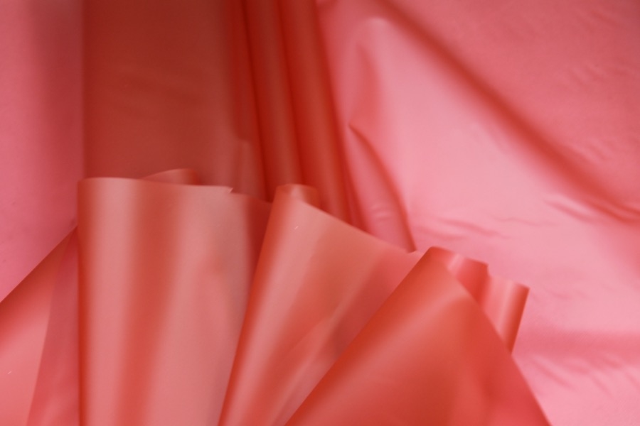 Blood-orange semi-transparent PVC look material, semi-sheer plastic type fabric, made of polyurethane, non-woven and thermoplastic. 130cm wide.