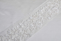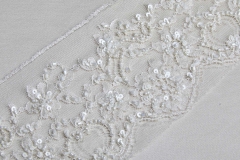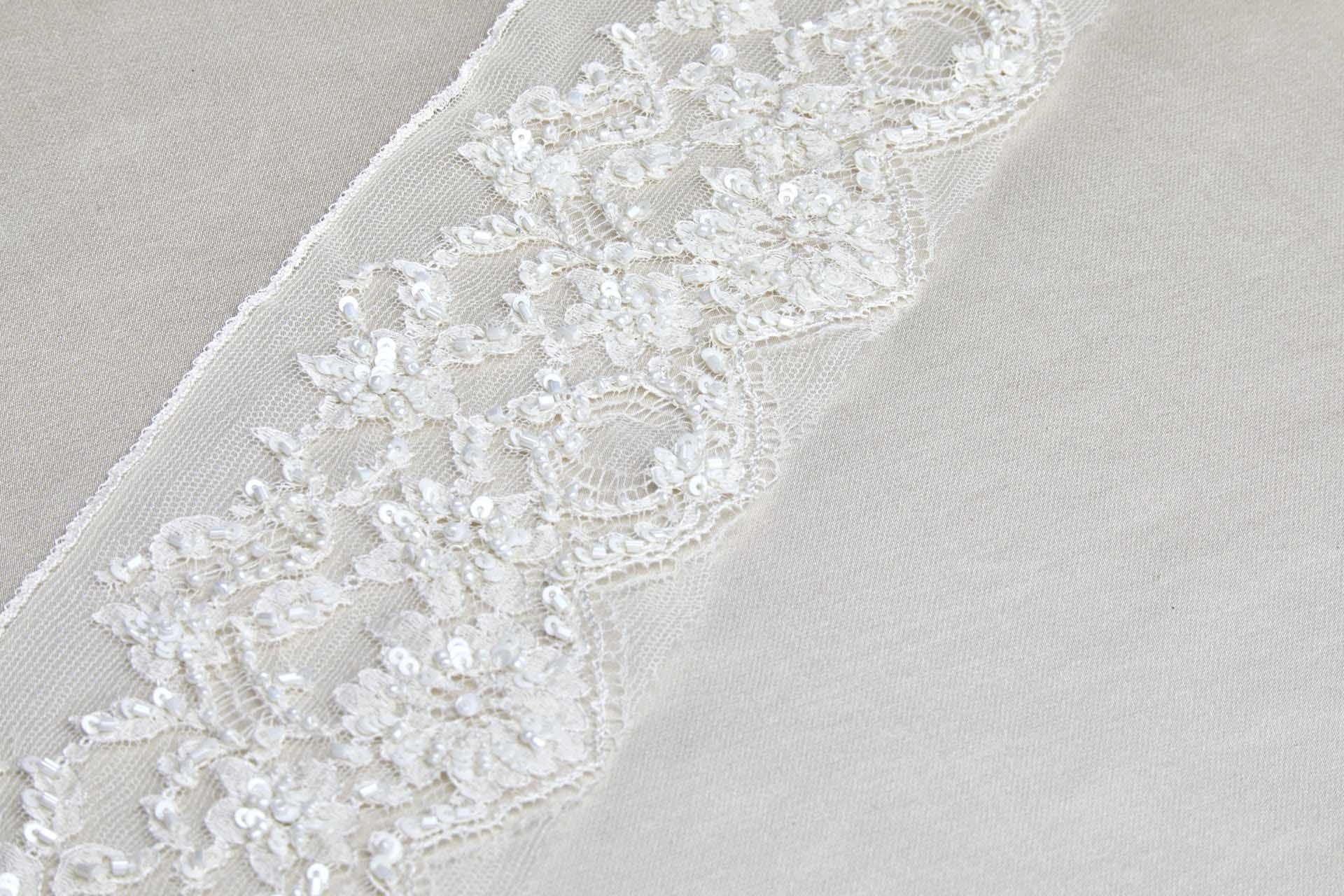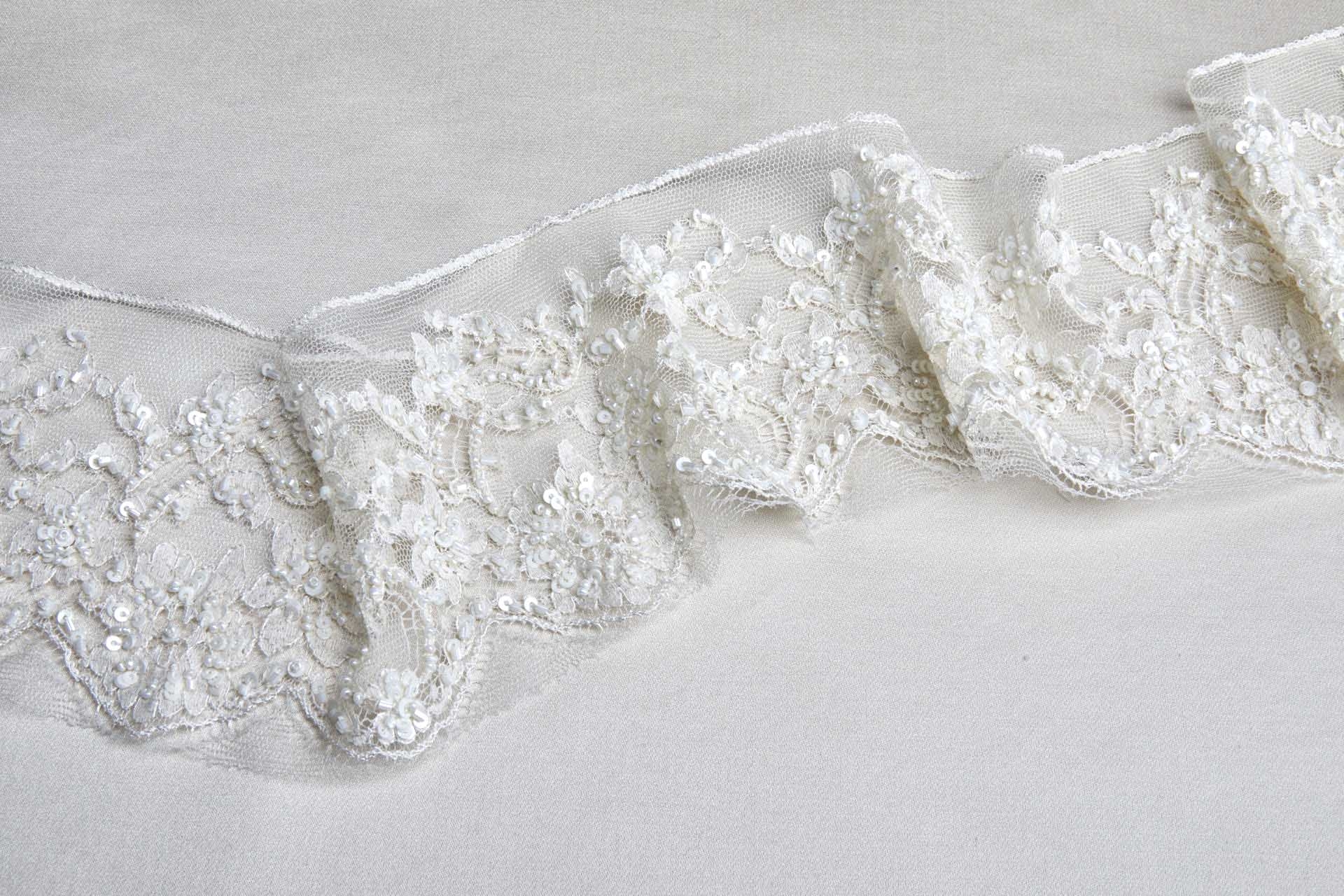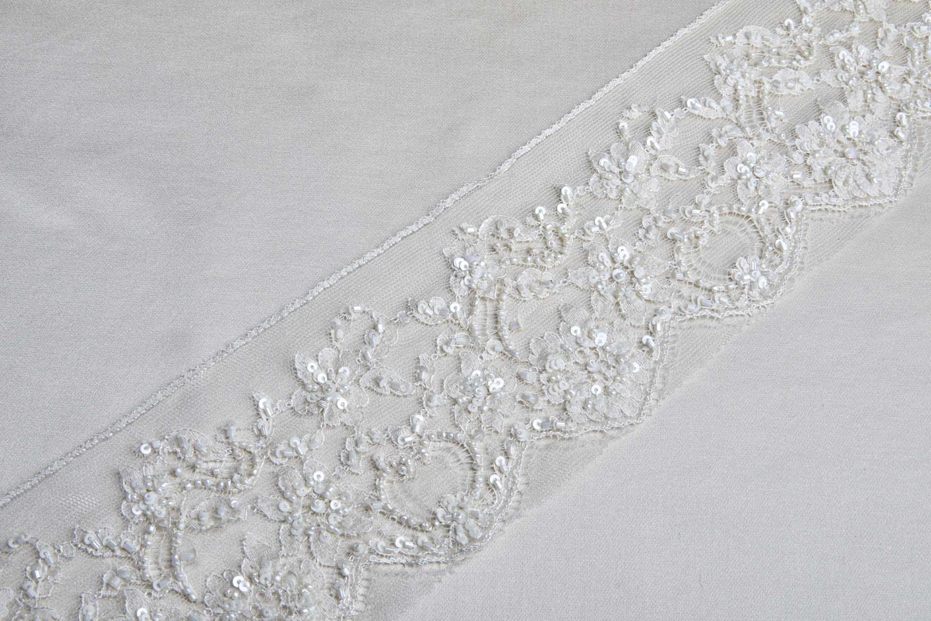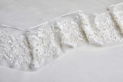 A wider beaded, sequinned and embroidered silk tulle trim in ivory, hand beaded with ivory sequins and bugle and seed beads. This trim measures aqpprox 12cm, and it has a single scallop.