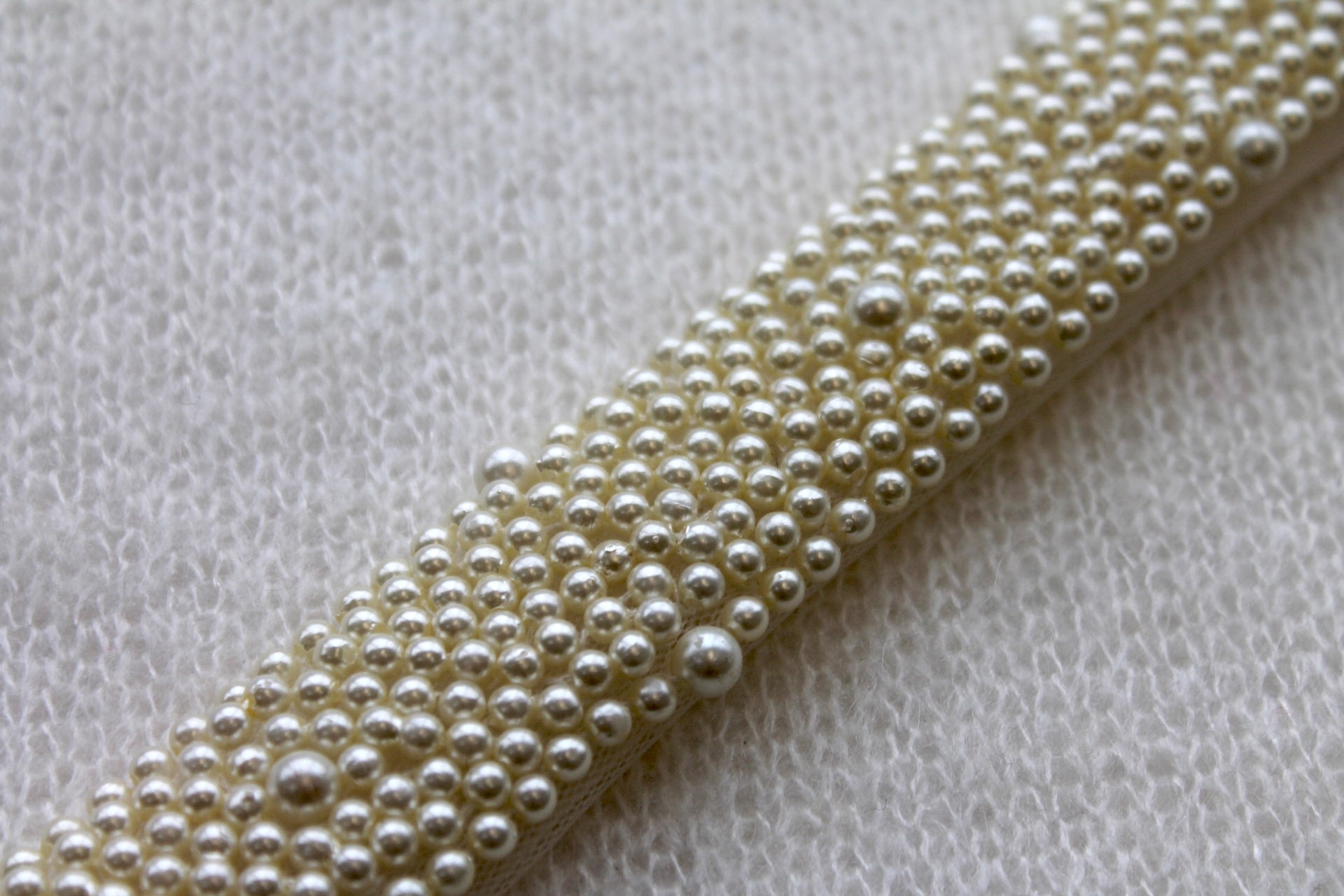 A unique and original trim of pearls in two sizes sewn onto a tulle base. This trim would make a beautiful bridal belt. The width measures approximately 3cm. Plastic pearls in cream.