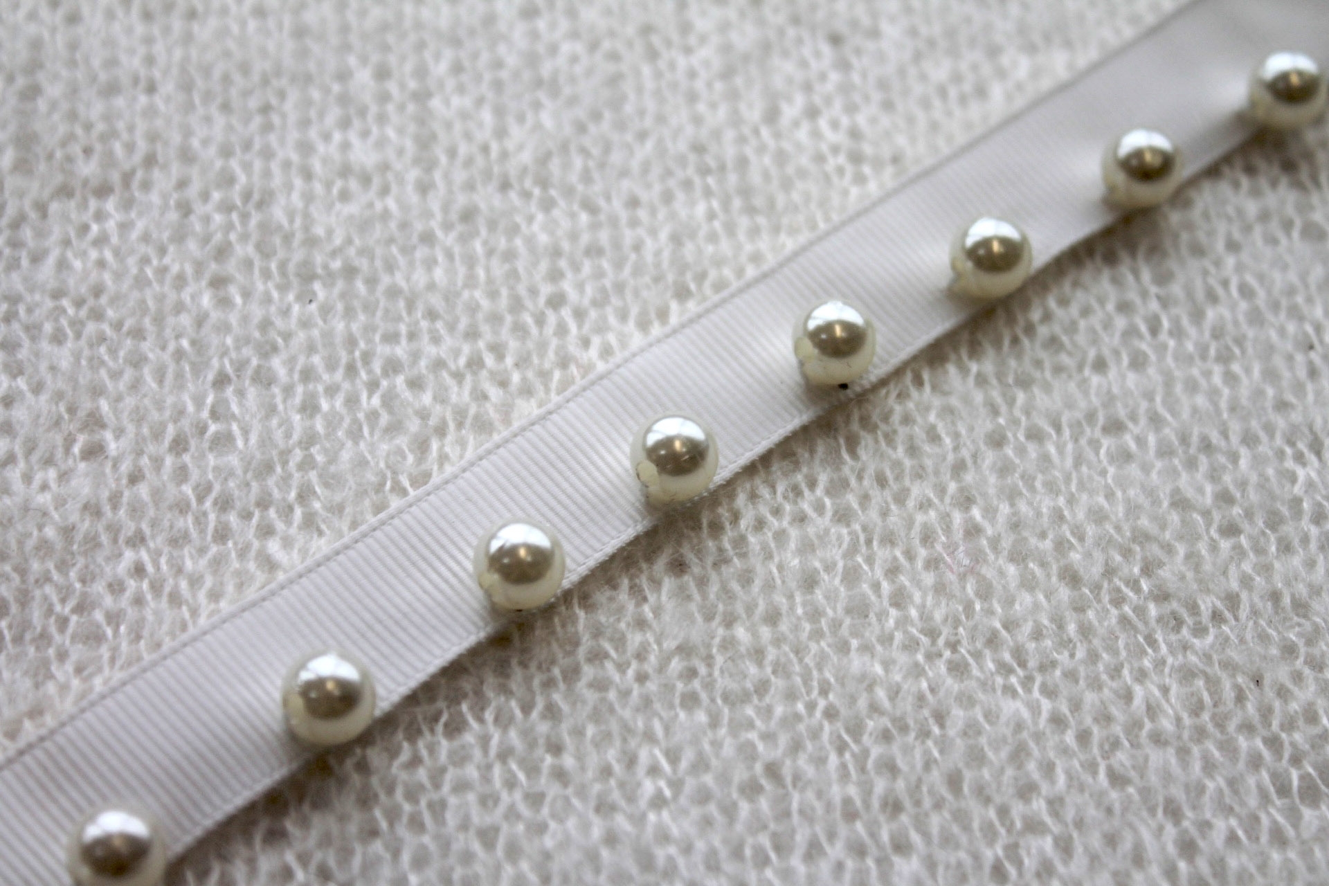 This trim is made from an ivory grosgrain ribbon, decorated with creamy ivory pearls.