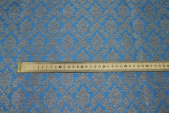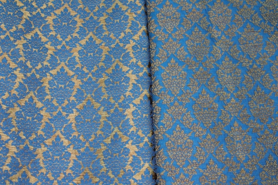 Poly-viscose mix brocade, hand loomed in India. Features a simple but ornamental design in bright blue and gold, no metallic thread. The design is somewhat reversible, see all images.