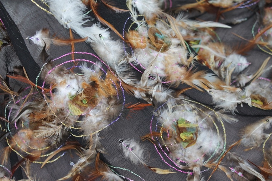 A black silk chiffon which has been embroidered in circles with a colour changing thread, real feathers in an assortment of shades of brown have been added to the circles, providing a delightful and fun fabric.