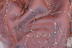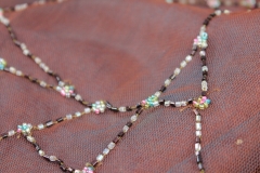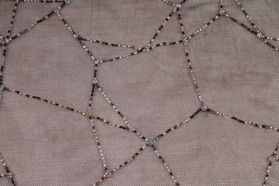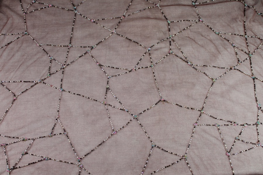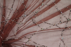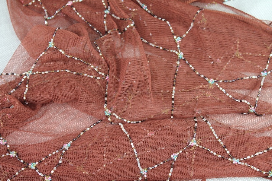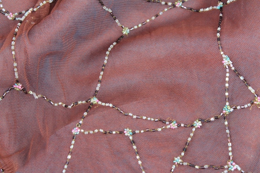 This is a brown nylon tulle with criss-cross lines of beads in several colours across the fabric. A fun but simple beaded fabric. 100 cm wide.