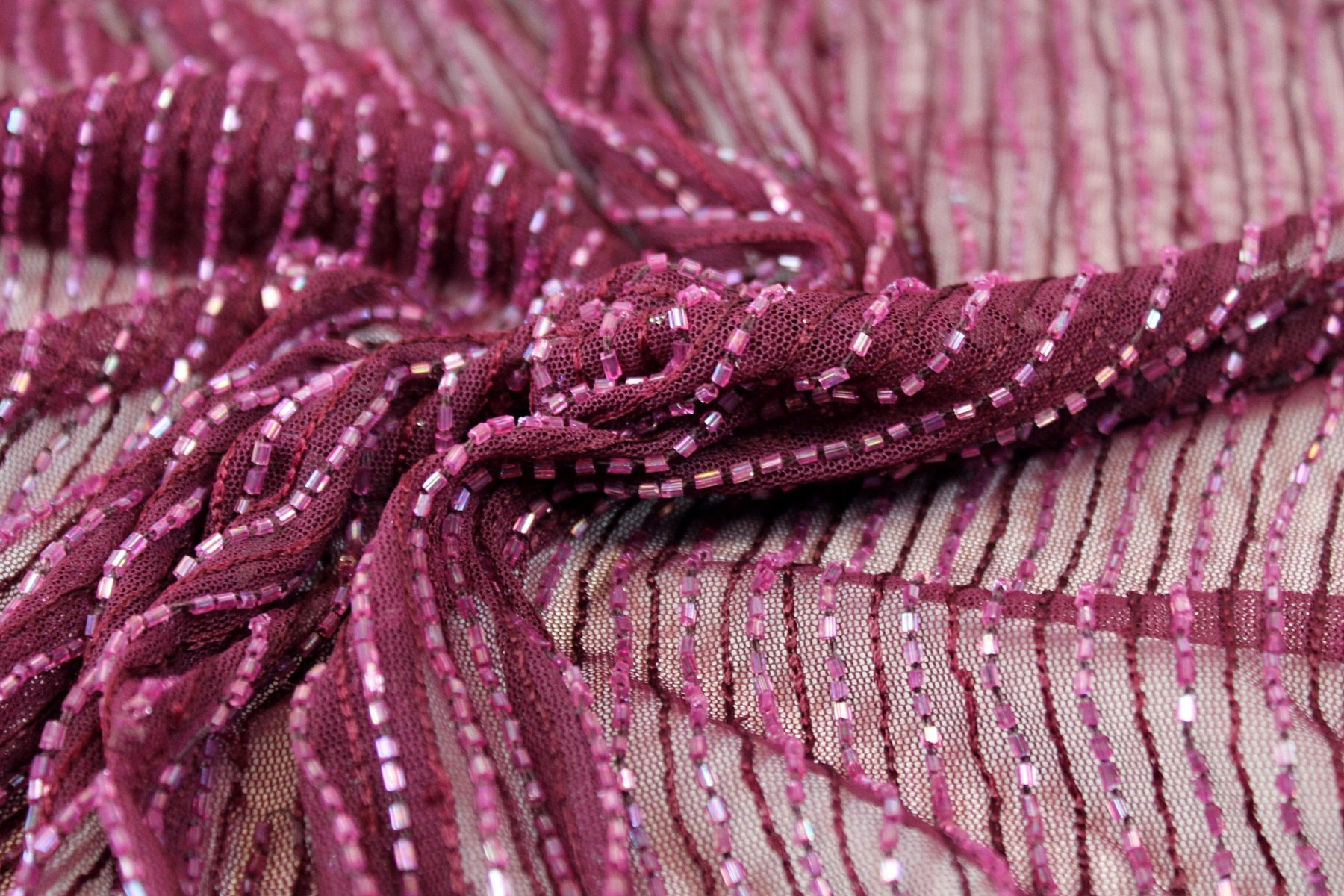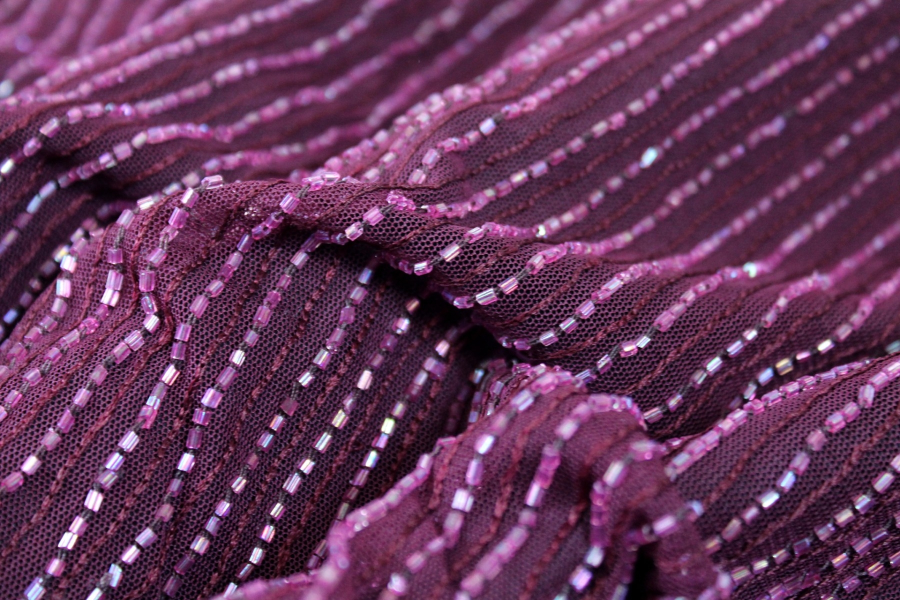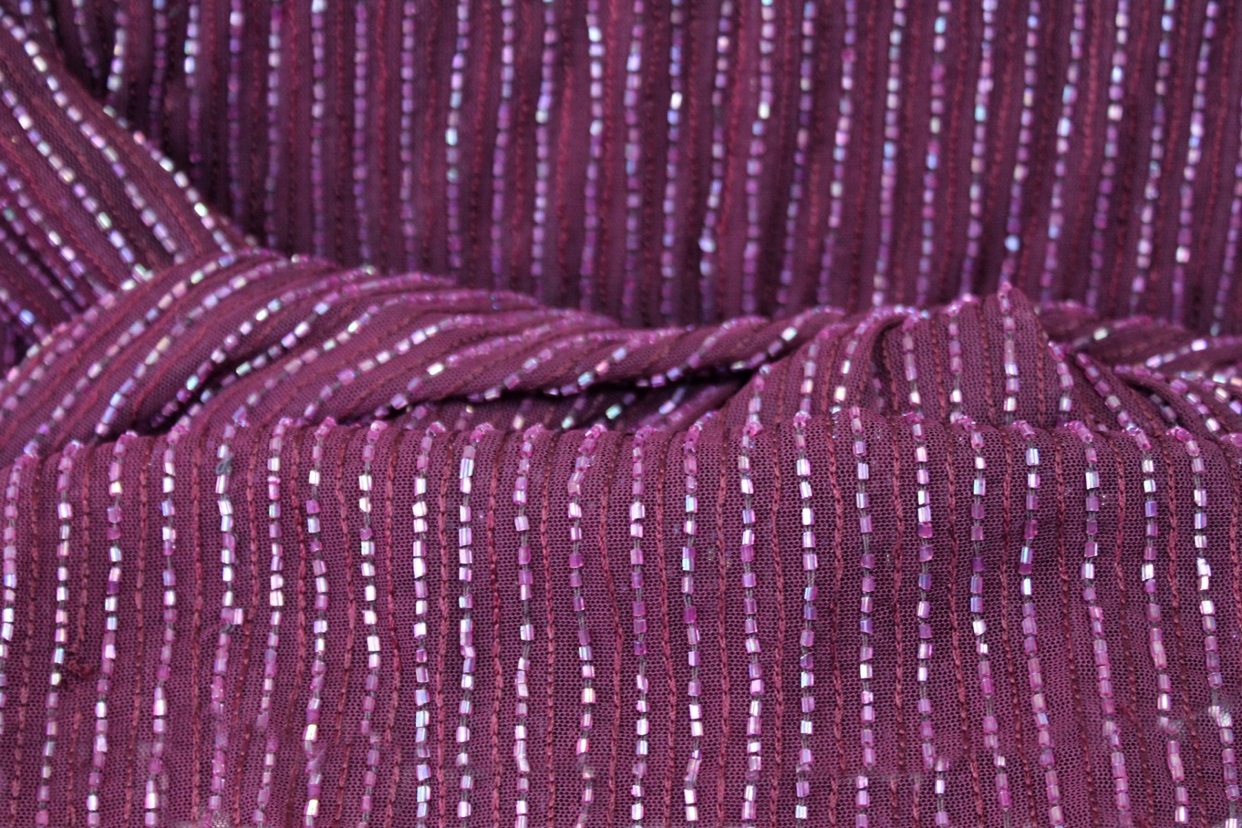 Burgundy tulle with matching embroidery and bugle bead stripes.