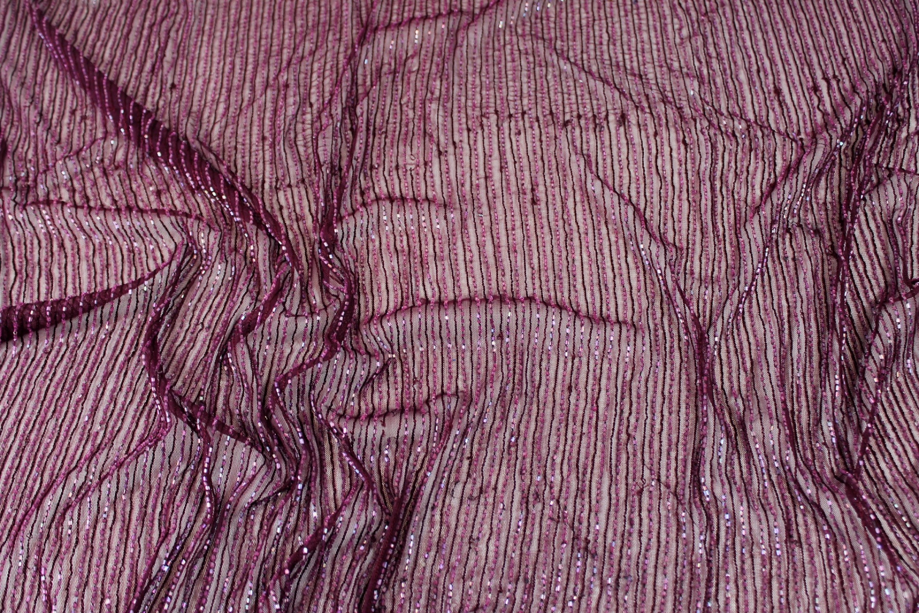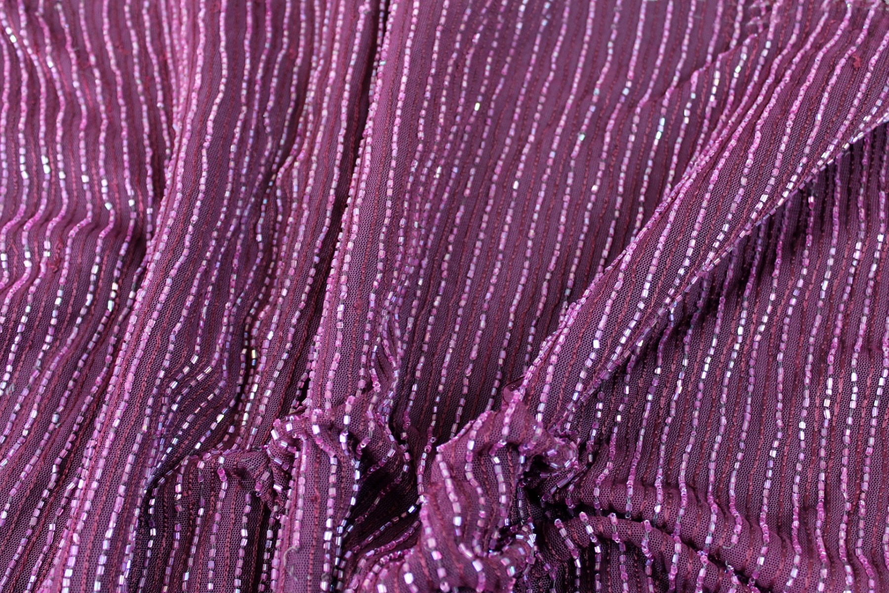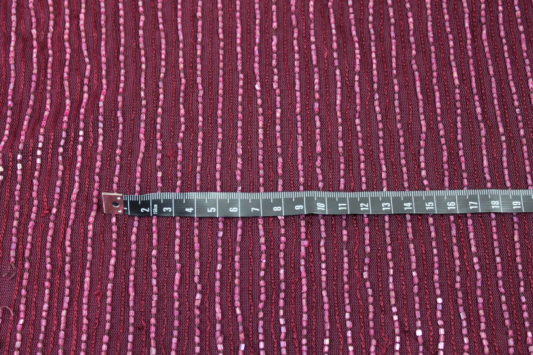 Burgundy tulle with matching embroidery and bugle bead stripes.
