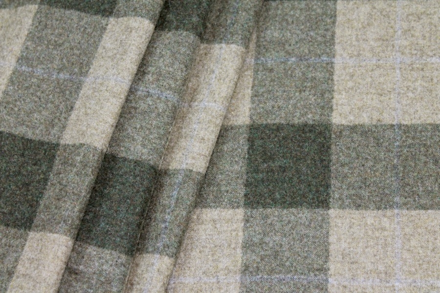 A high quality European made wool, woven in a check pattern of greens and khaki, with beige and grey in the weave. It would be perfect for light jackets or suits, or even interiors.