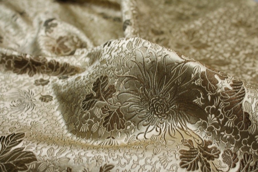 Traditional Chinese brocade in classic designs, this one features classic chrysanthemum flowers in golds. Suitable for interiors. Silk/viscose mix.