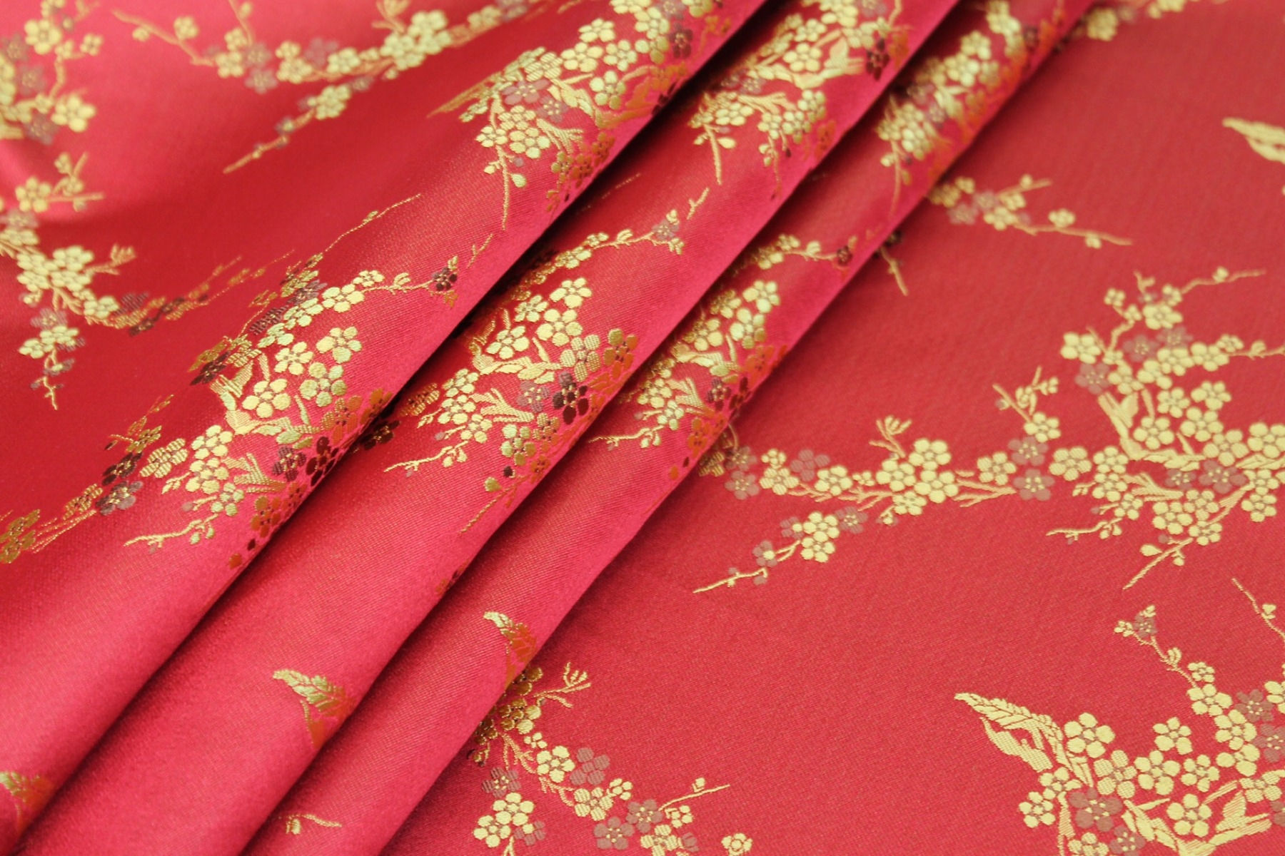 This is a wide width brocade based on a traditional Chinese brocade design, this one features classic cherry blossoms and branches in yellow on a red ground. Suitable for interiors. 140cm wide.