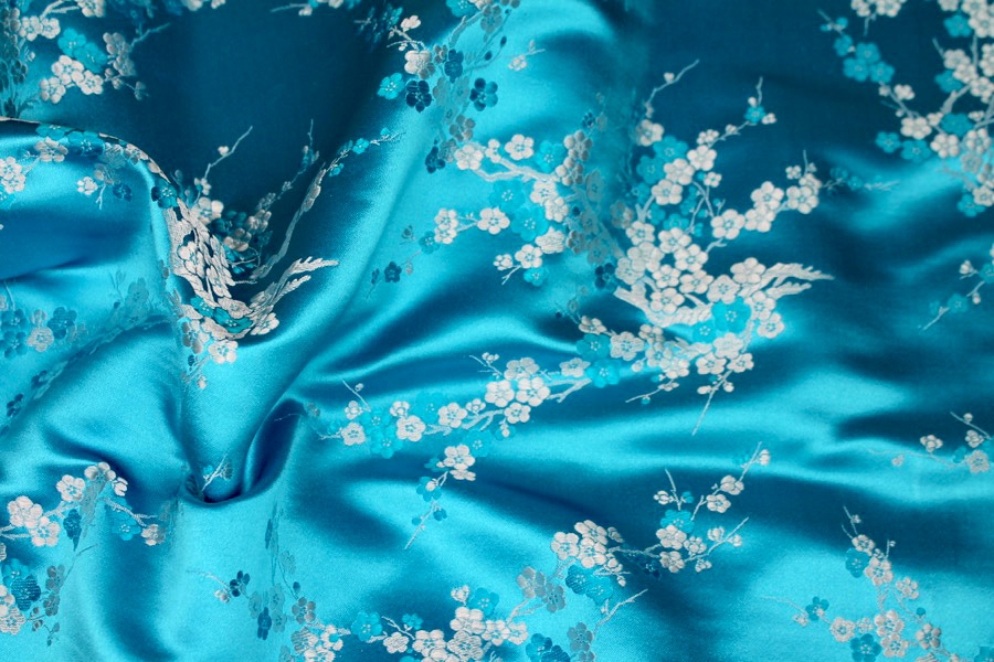 Traditional Chinese brocade in classic designs, this one features classic cherry blossoms and branches in white on a striking turquoise ground. Suitable for interiors.