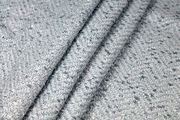 This fabric is made of a sumptuous viscose chenille yarn, woven in a large herringbone pattern, this one in a pale blue colour, resembling the texture of a silk matka. To keep it light and pliable, this particular quality is 100% viscose.