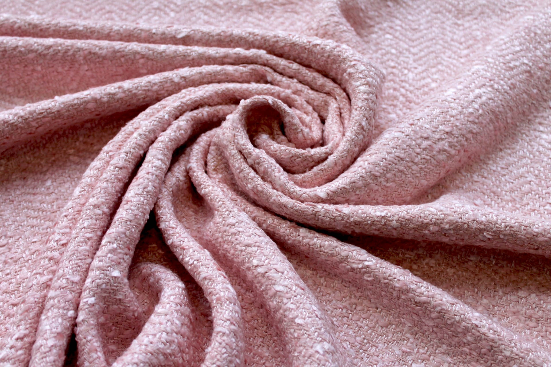 This fabric is made of a sumptuous chenille yarn, woven in a large herringbone pattern, this one in a pale pink colour, resembling the texture of a silk matka. To keep it light and pliable, this particular quality is 100% viscose.