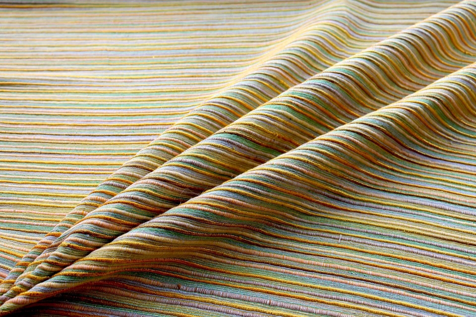 This one is woven with colour changing hand dyed mixed fibre threads of various thicknesses in greens, greys and pinks with black and white, creating a check pattern. 20% wool, 40% viscose, 20% cotton, 20% poly.