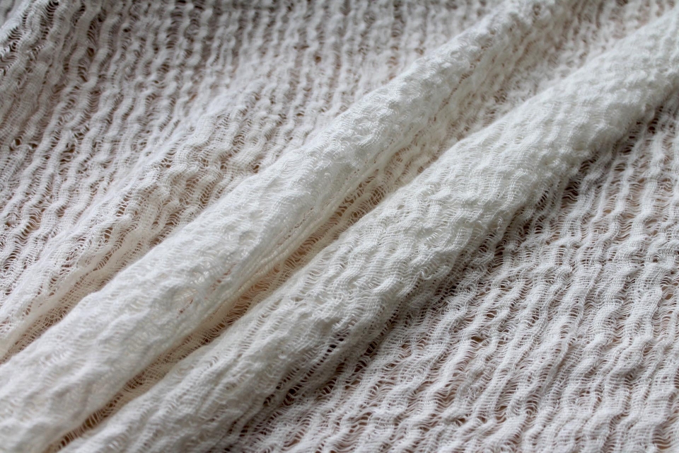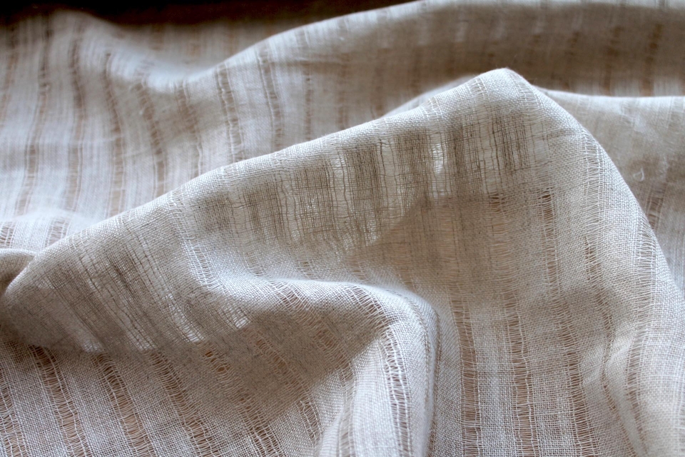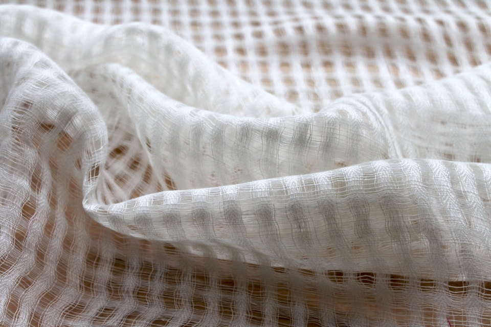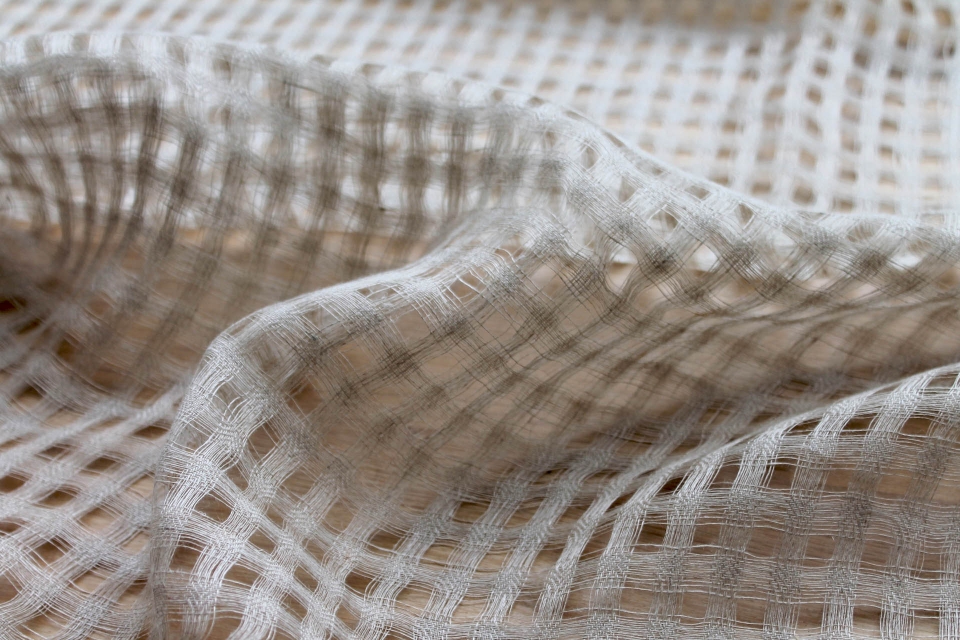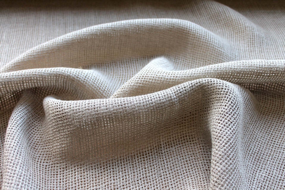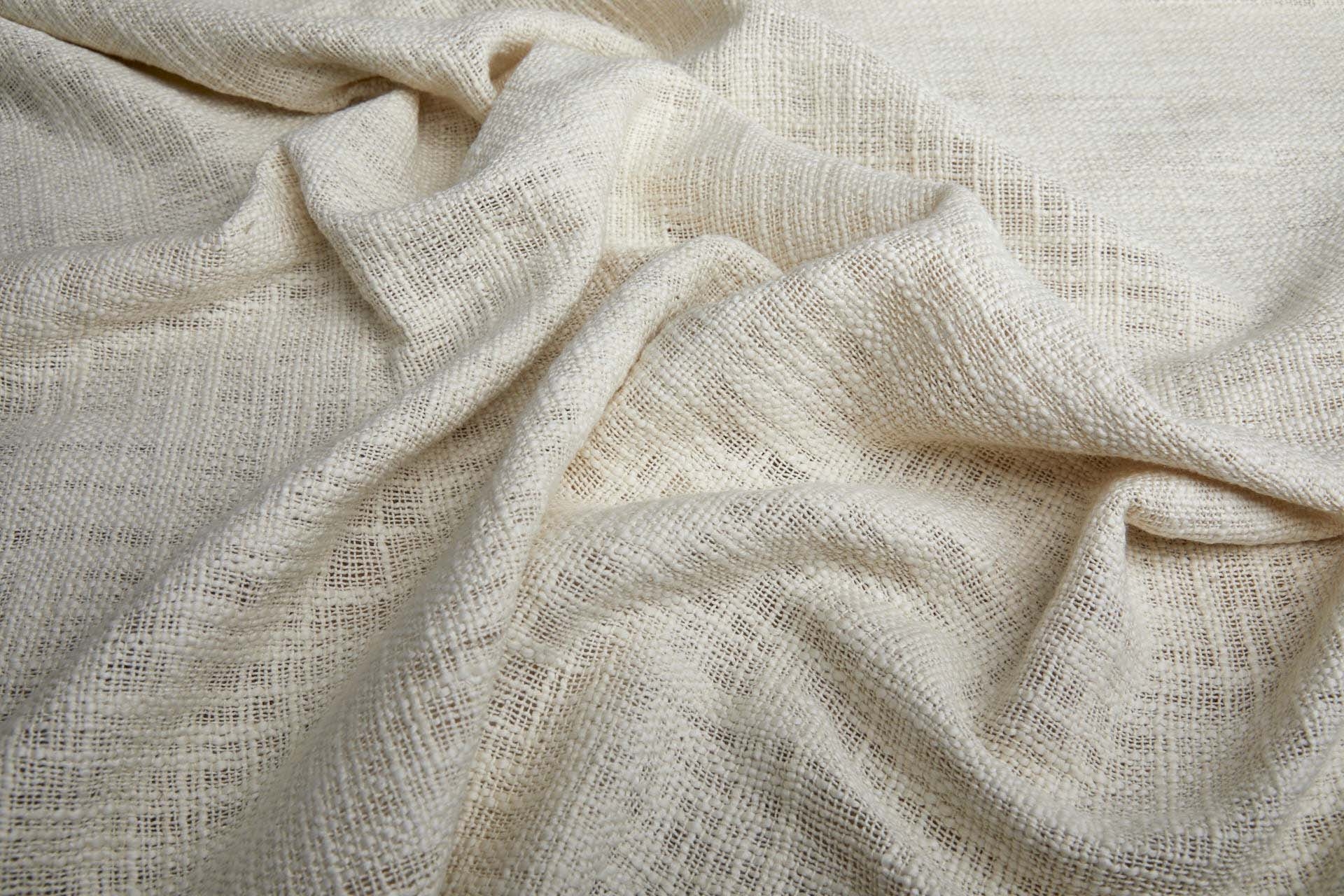 Soft cotton yarn in irregular thickness make up the warp and weft of this chunky yet sheer fabric. Can be dyed, great for distressing.