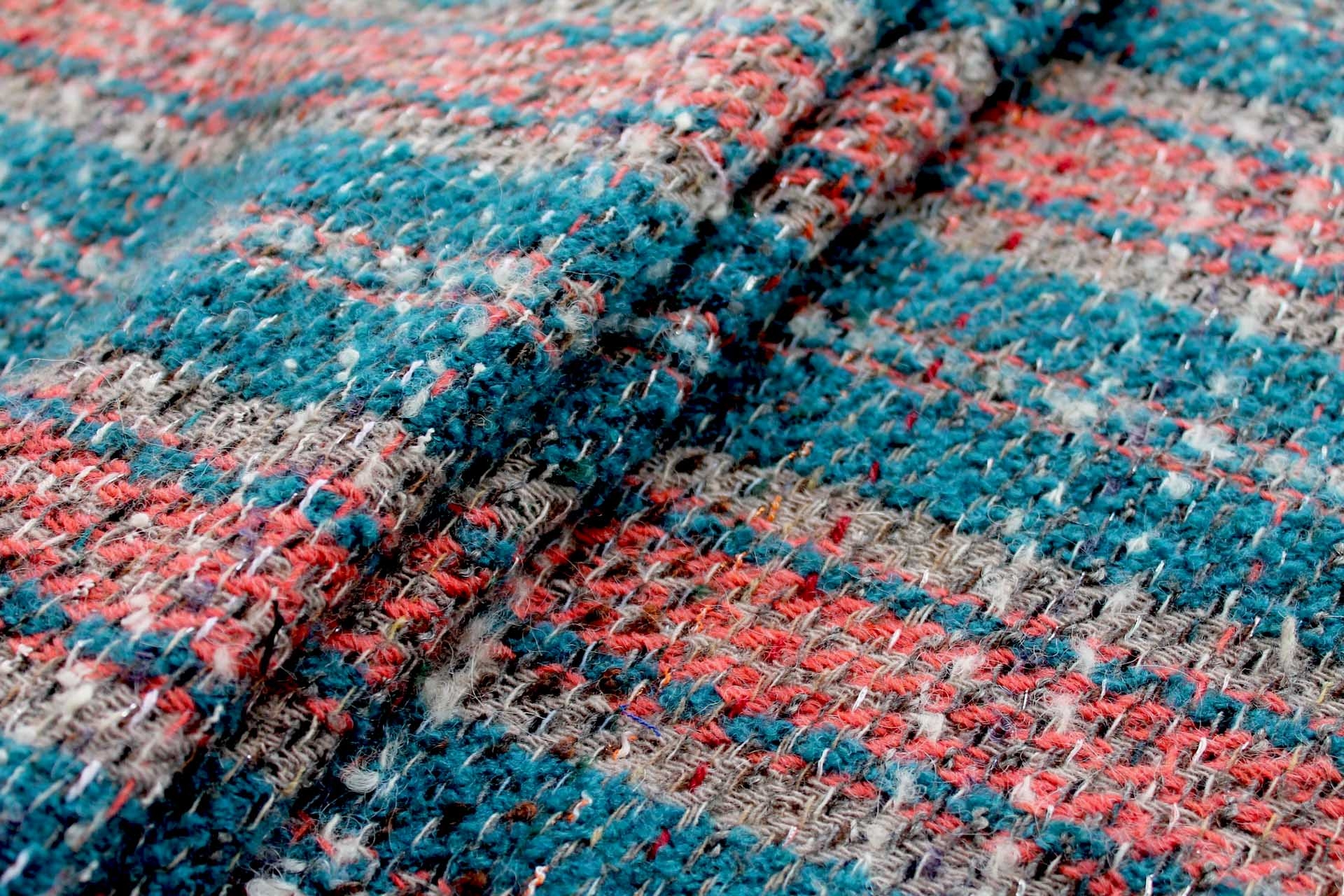 This wool blend is a chunkier textural weave, with a combination of thicker and thinner threads, this one in shades of brown with red and cream, with flecks of purple and orange creating a check pattern.