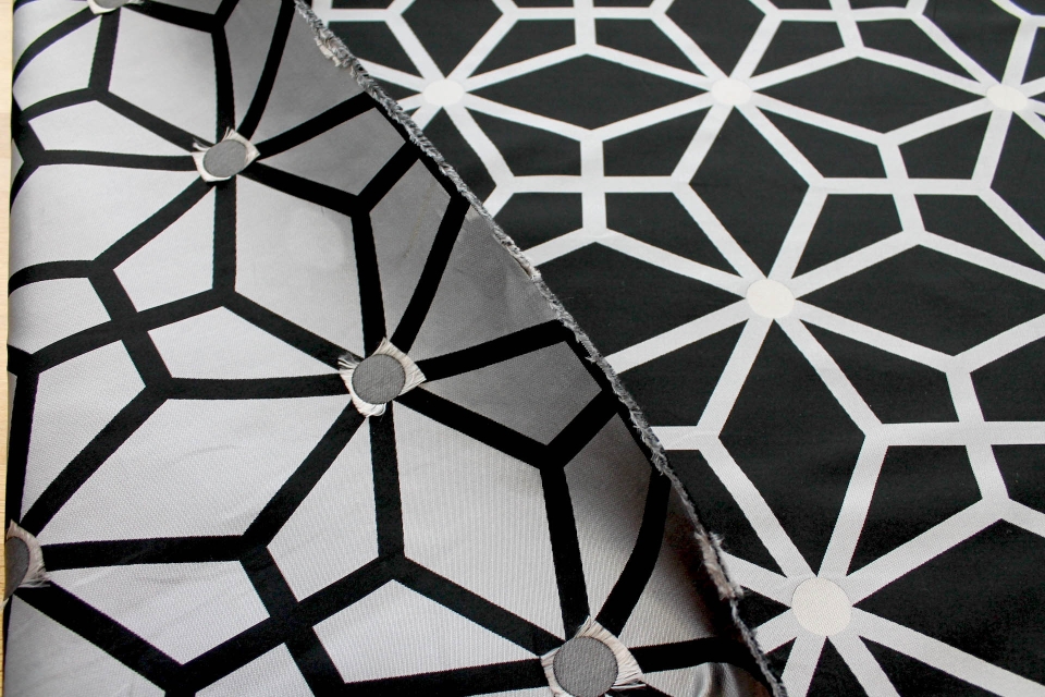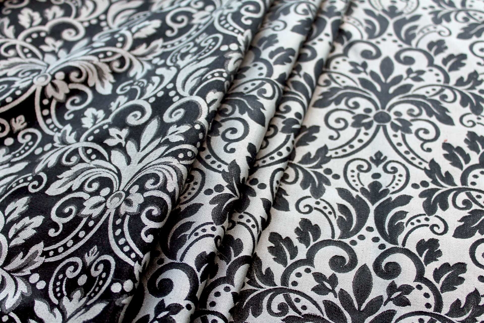 A stunning brocade in a classic rococo design, fully reversible, woven in anthracite and black. Great for furnishings as well as fashion and costumes. 100% polyester.