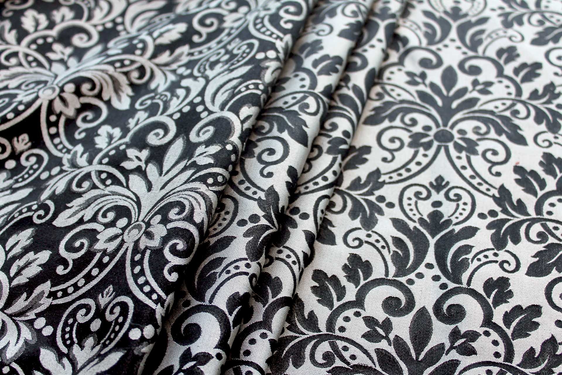 A stunning brocade in a classic rococo design, fully reversible, woven in white and black, that reads silver grey. Great for furnishings as well as fashion and costumes. 100% silk.