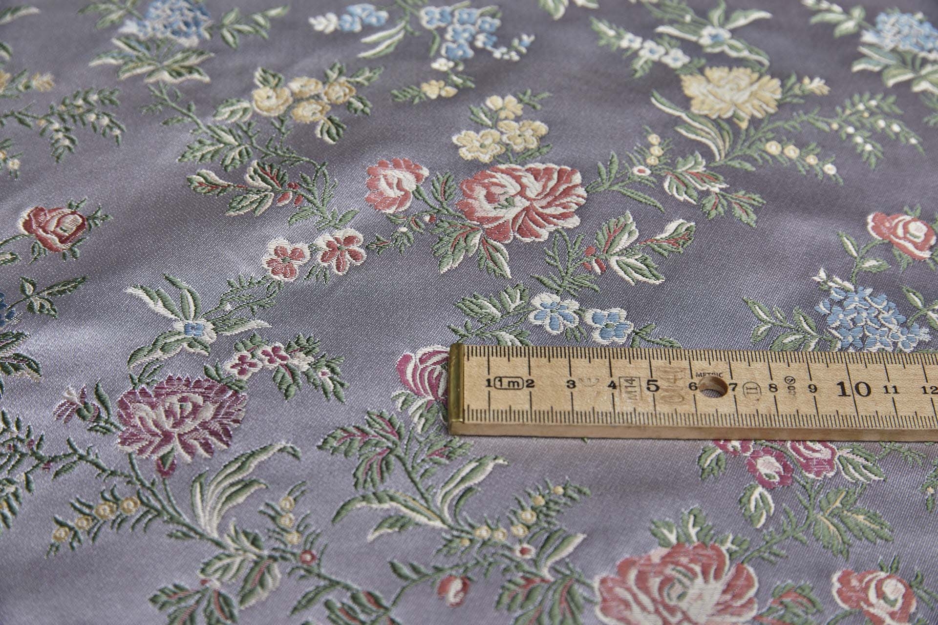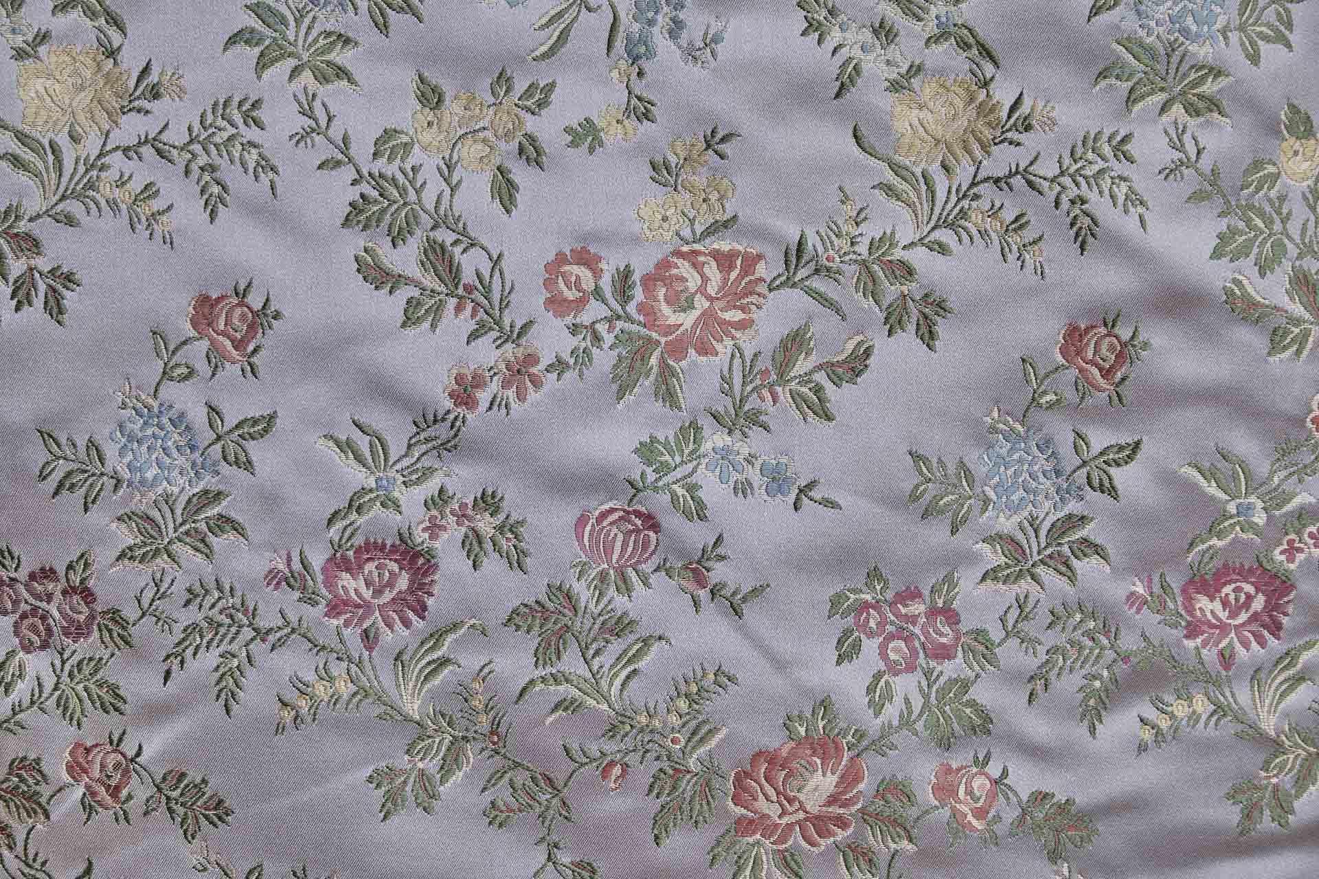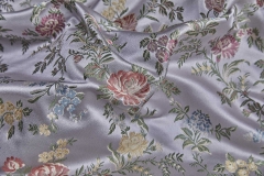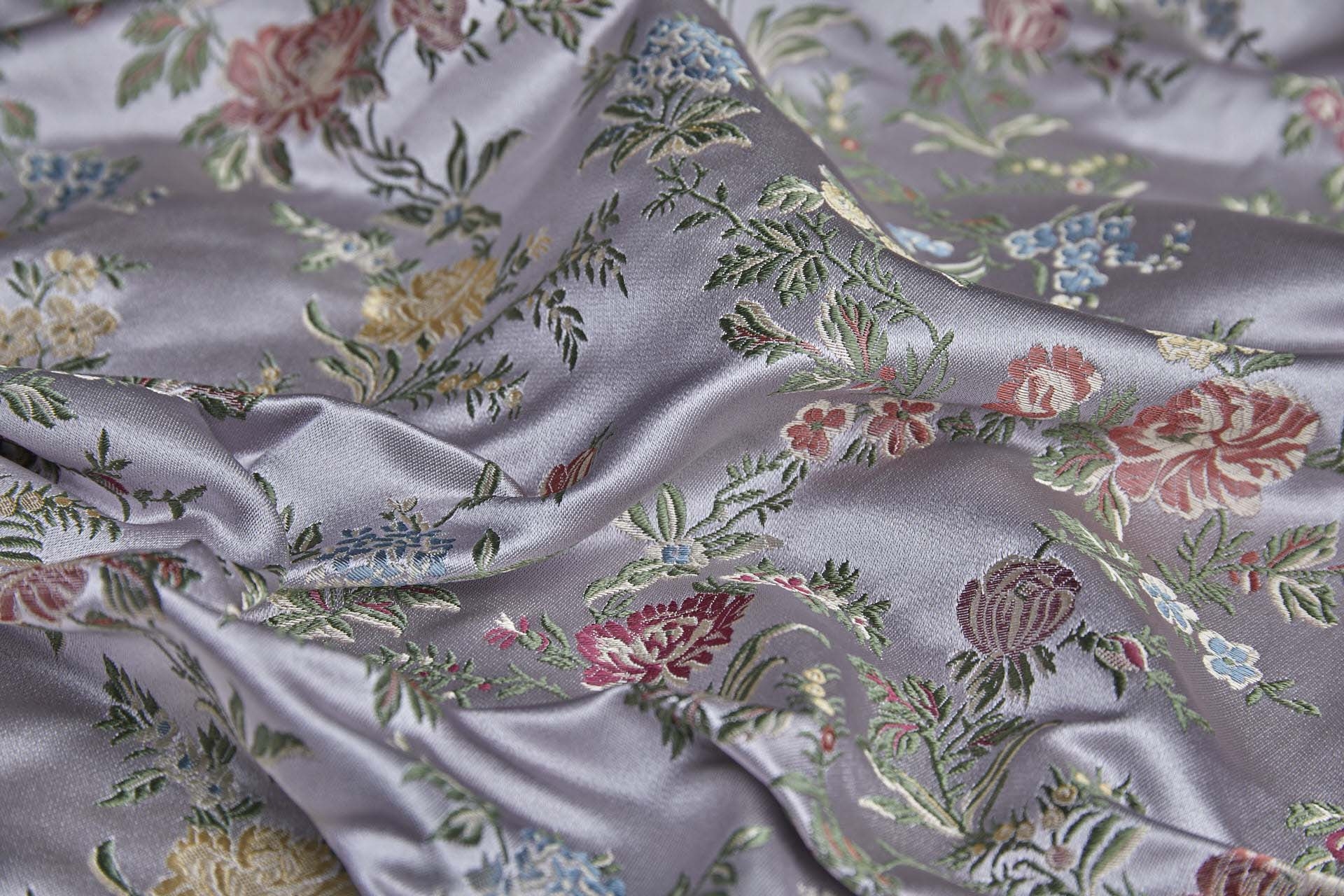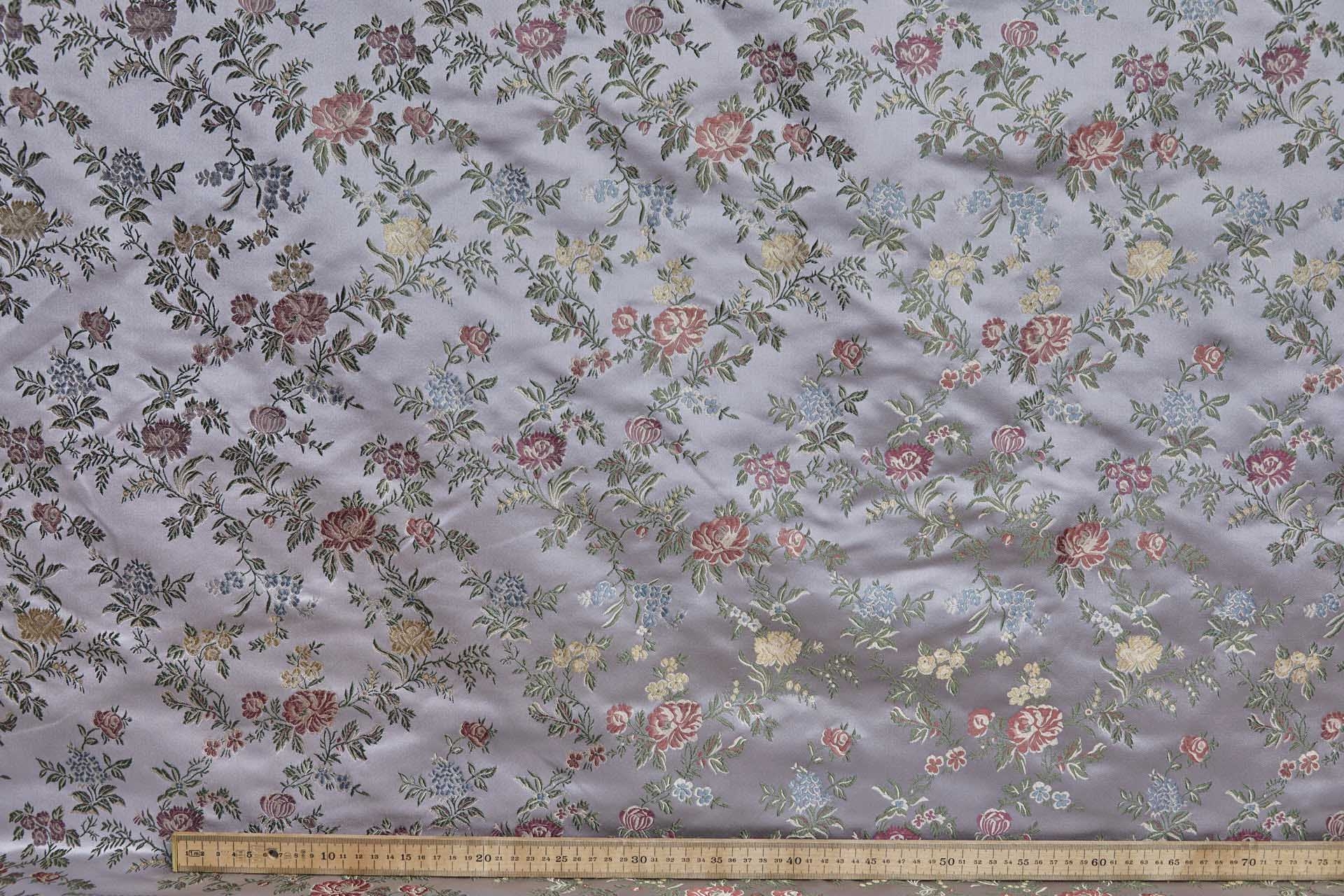 Made with a duchess satin base, this classic Regency style floral brocade has a multitude of colours on a pale lilac base. 140cm wide.