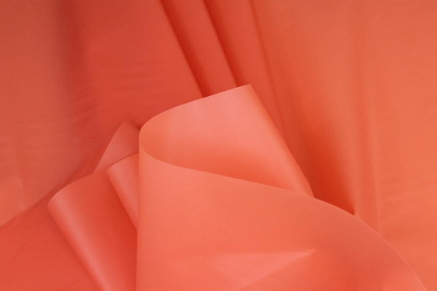 Coral semi transparent PVC look material, semi-sheer plastic type fabric, made of polyurethane, non-woven and thermoplastic. 130cm wide.