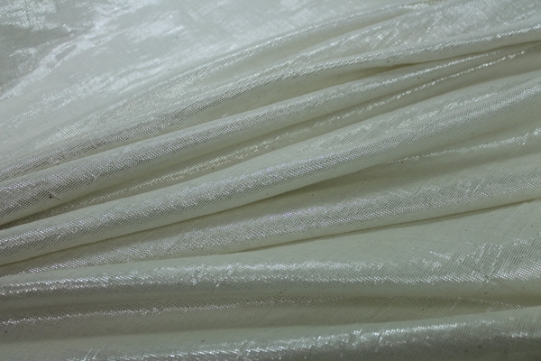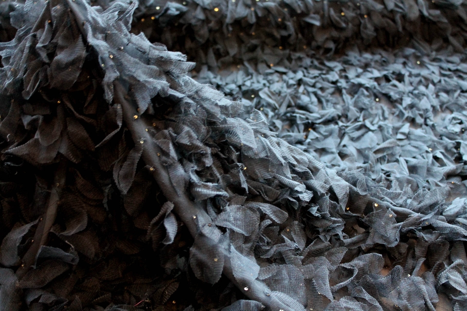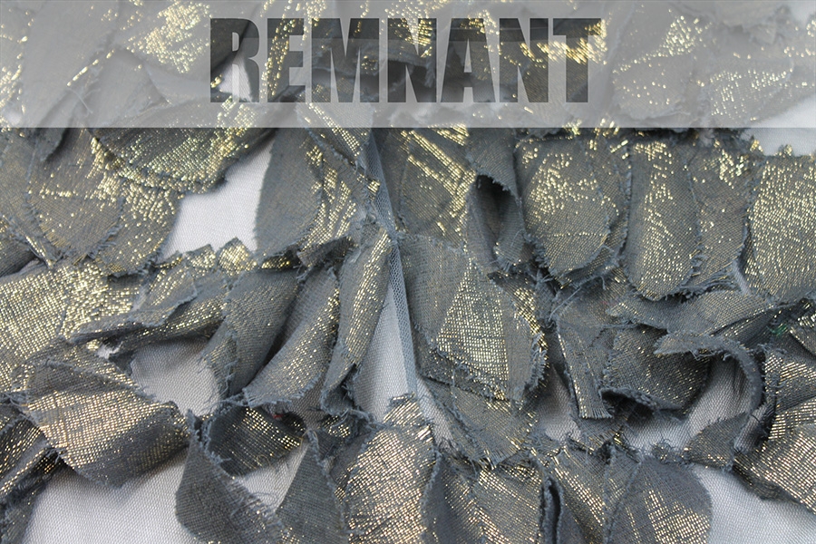 This is a remnant piece of a fantastic textured fabric, made up of leaves cut from a cotton and lurex weave fabric in grey and gold, sewn onto an ivory nylon tulle in an overlapping fringe-like pattern.
