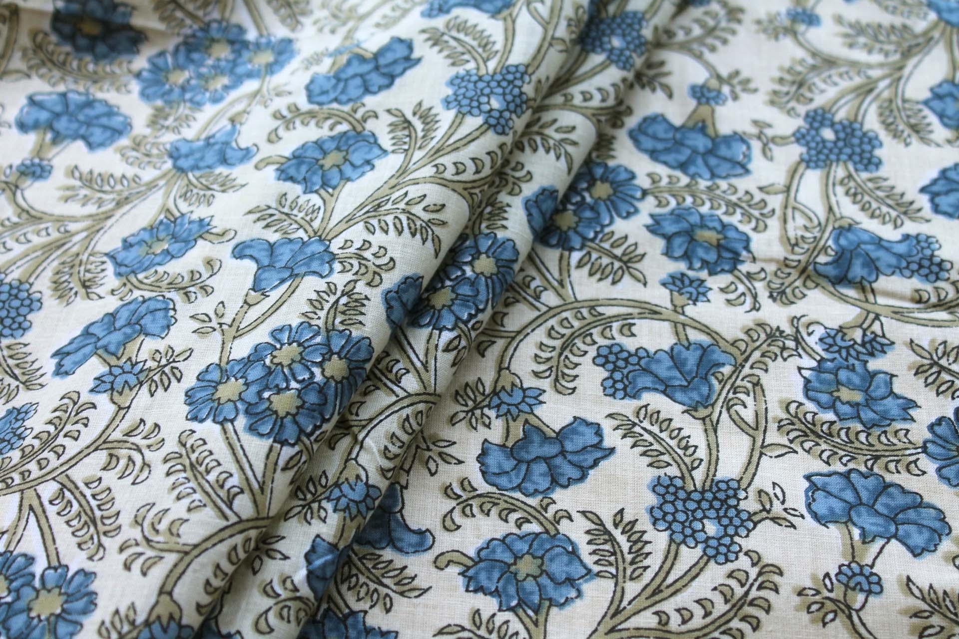 Printed cotton lawn, with a larger floral pattern in blues and khaki on pale buttery yellow.