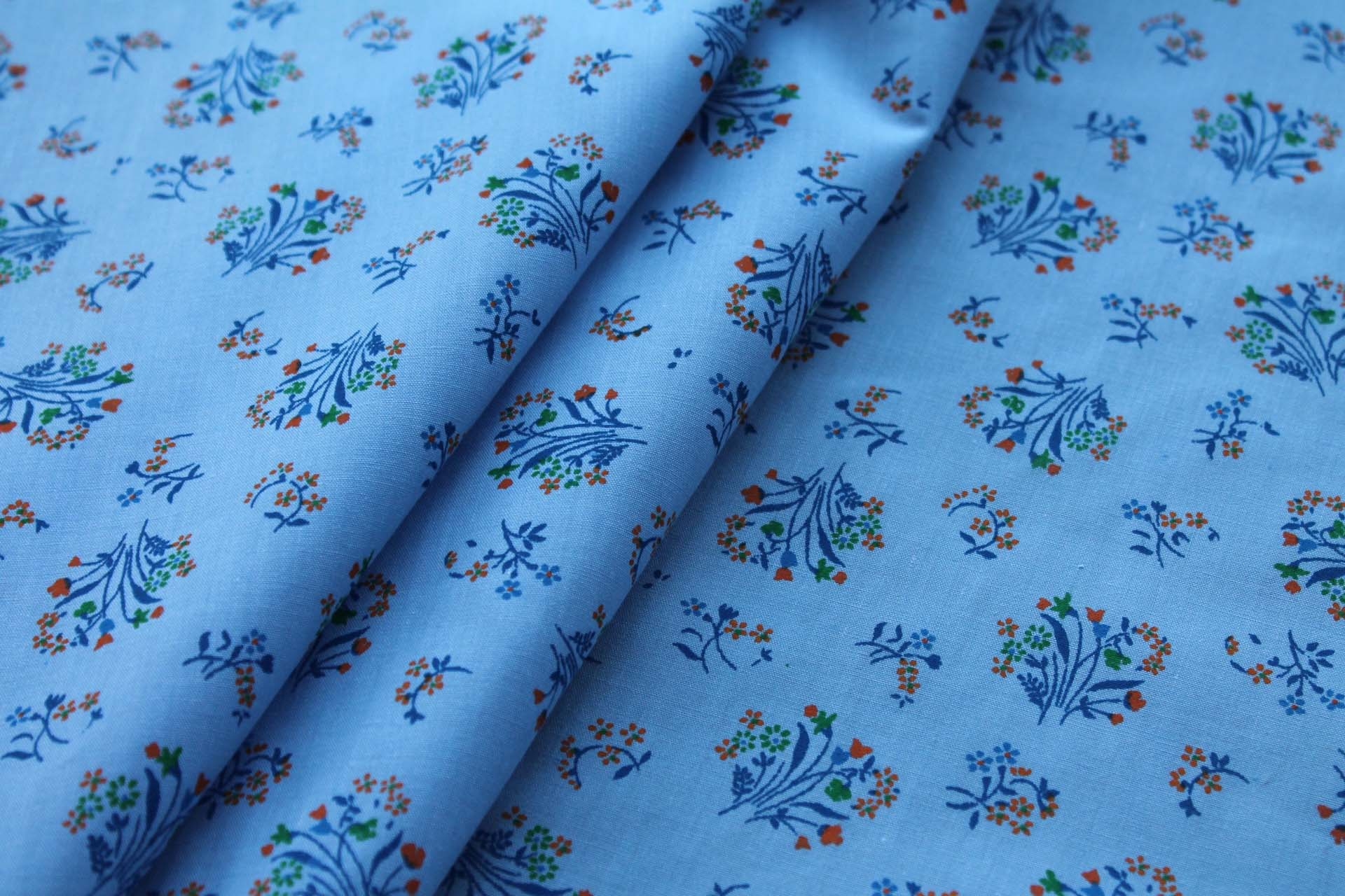 Vintage Printed Cotton - Orange, Blue and Green on Sky Blue is available to buy in increments of 0.1 metres.