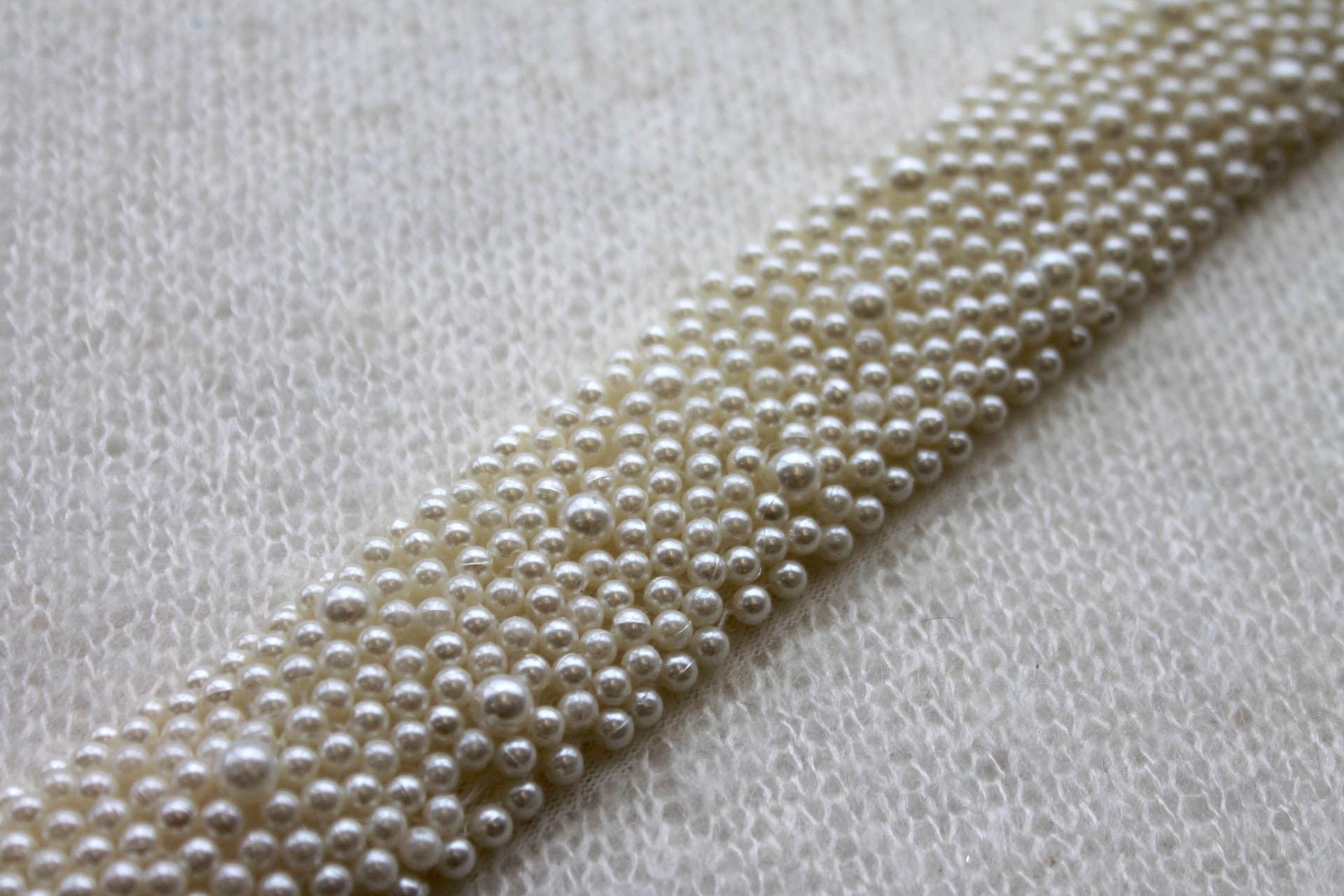 A unique and original trim of pearls in two sizes sewn onto a tulle base. This trim would make a beautiful bridal belt.