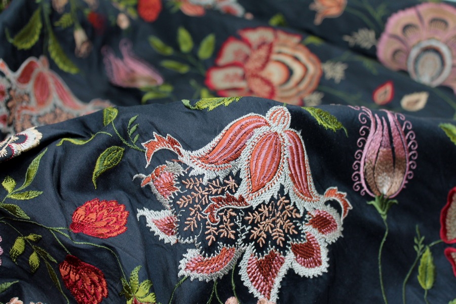 It's firm but supple, with a slight dull sheen. It has been embroidered with large florals in shades of pinks, greens, golds and reds.