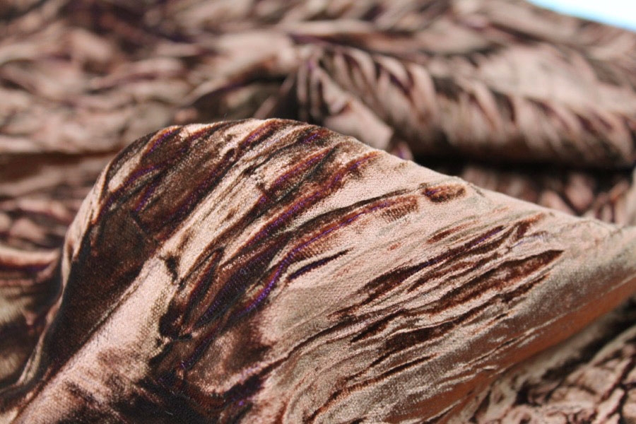 A luxurious crushed viscose velvet in bronze, woven on a purple background.