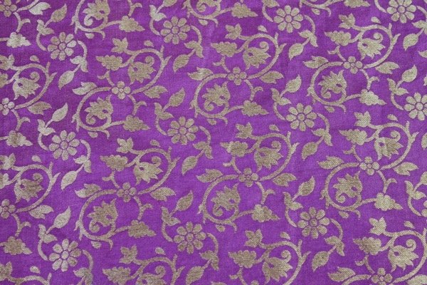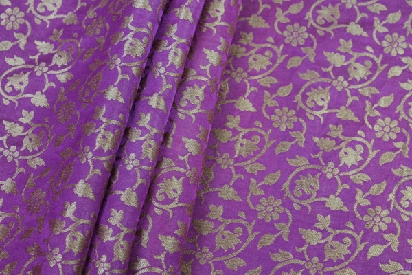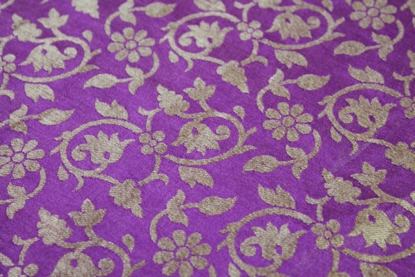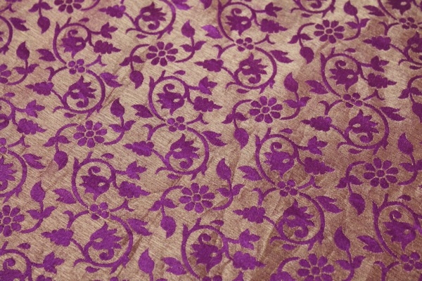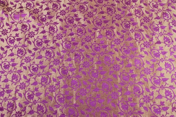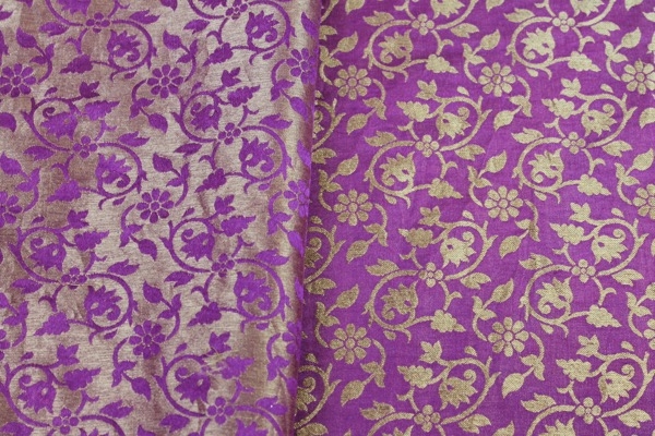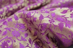 A beautifully soft and drapey brocade, woven in a floral pattern, in african violet and straw gold, fully reversible.