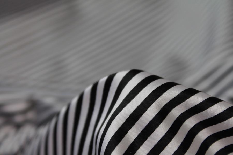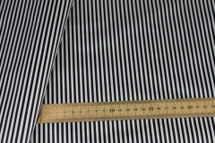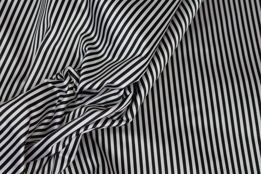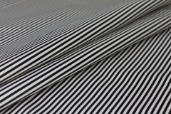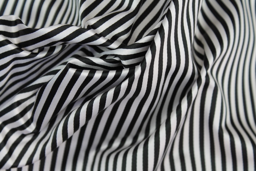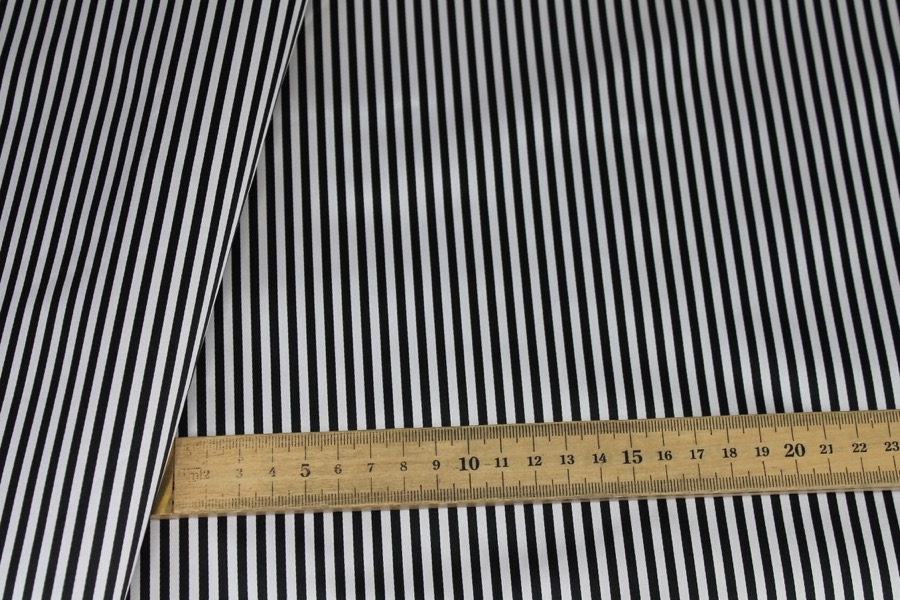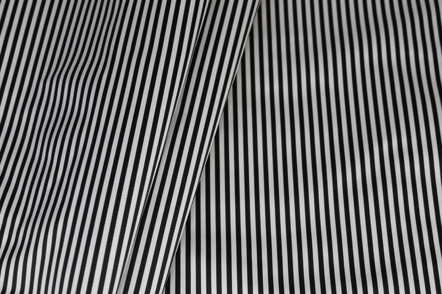 A high quality European polyester duchesse satin in black and white printed stripes, the stripes are approximately 0.3cm wide, and run down the length of the fabric.