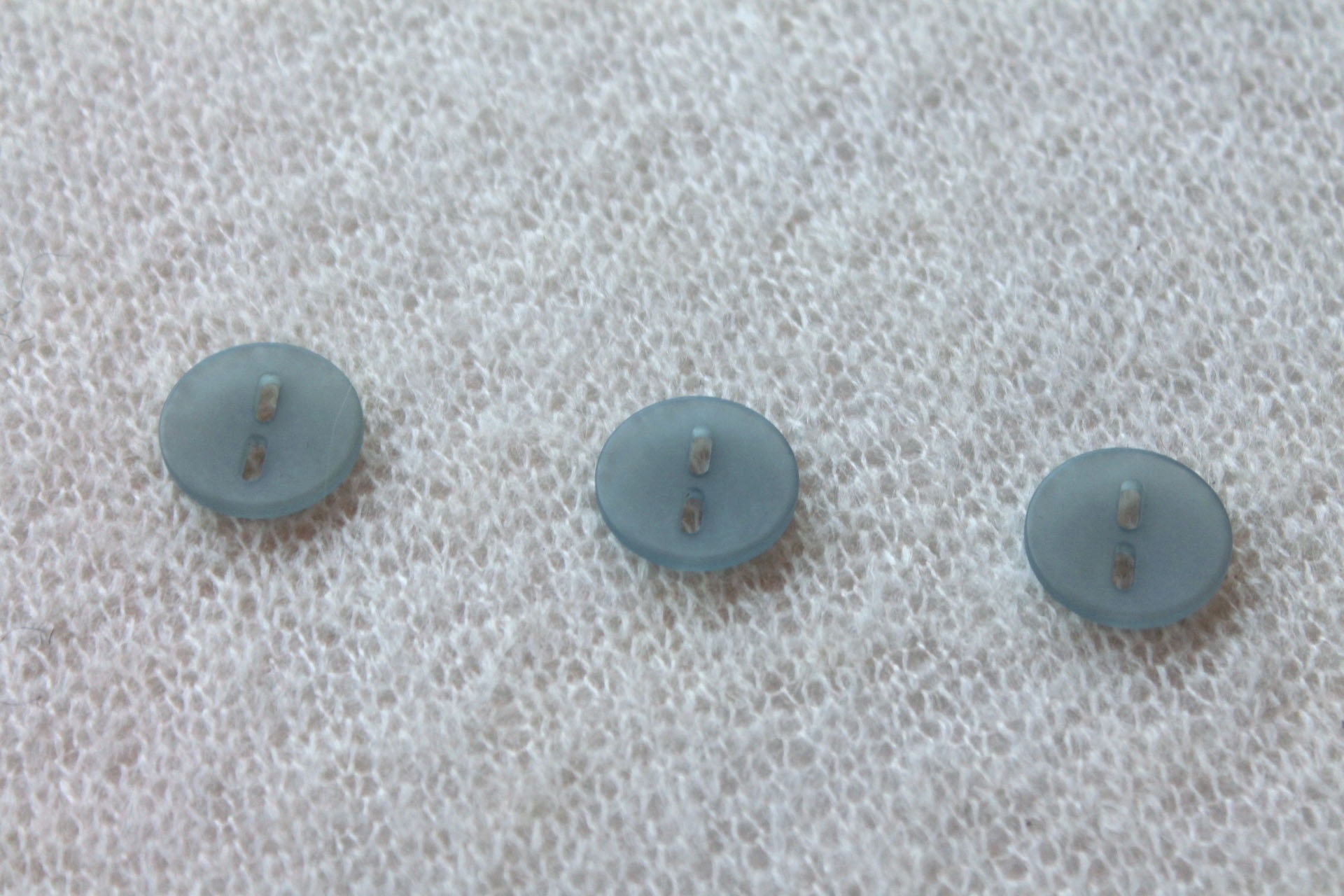 Round dusty blue button in frosted acrylic, with elongated slit holes as a design feature. Measures 2.5cm across. Available in other colours.