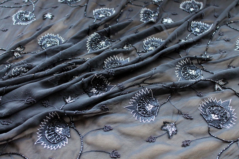 Black Organza with Multicoloured Floral Swirl Sequin and Beading