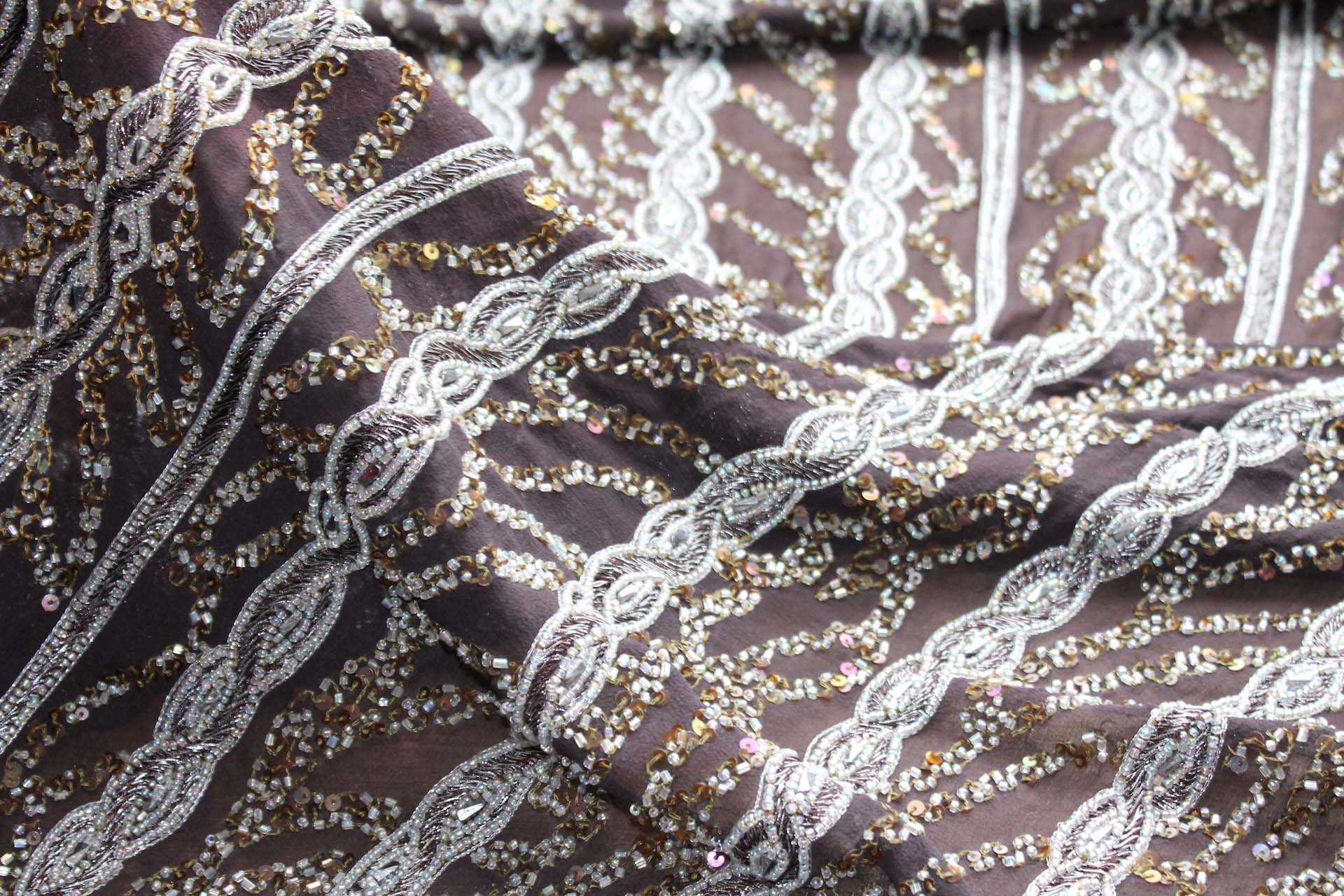 This is a brown silk chiffon with brown and metallic silver embroidery and beading in a twist/plait pattern.