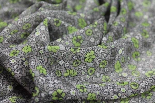A high quality European made chiffon with a small scale floral print in shades of green on grey background.