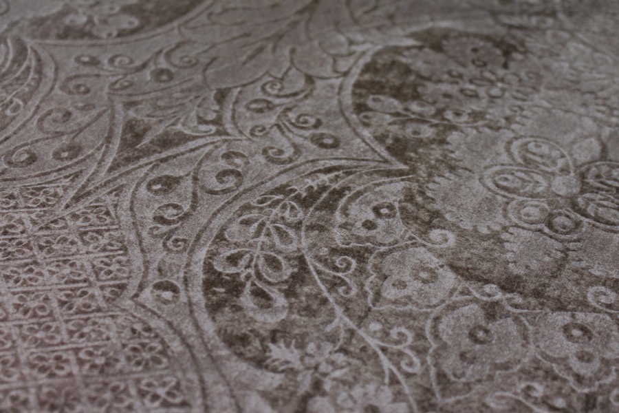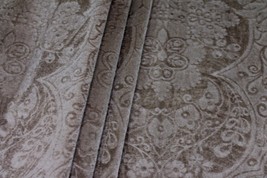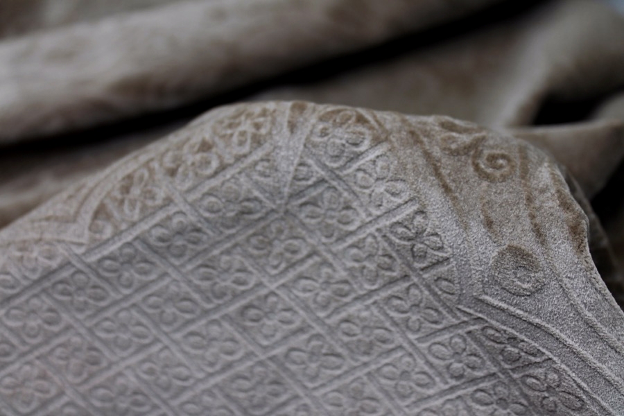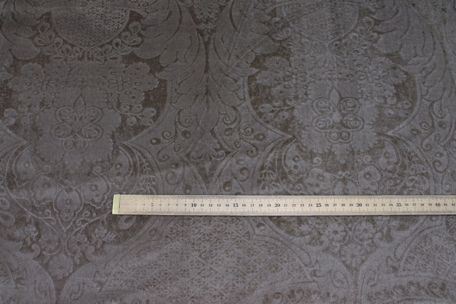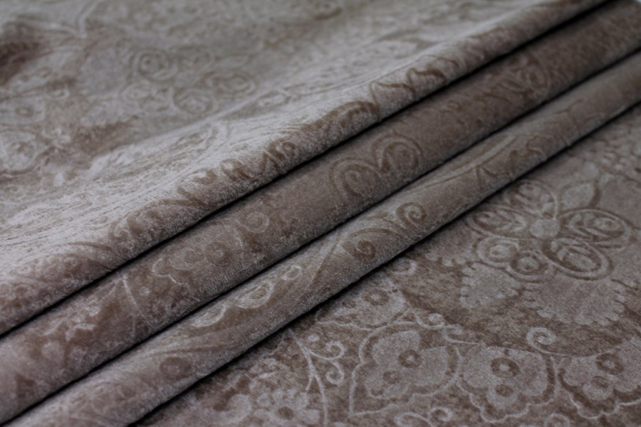 A luxurious 100% cotton velvet in mink with a detailed embossed pattern.