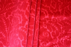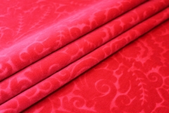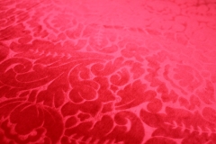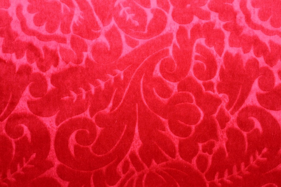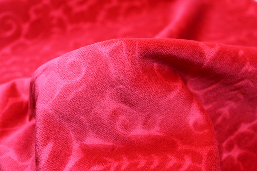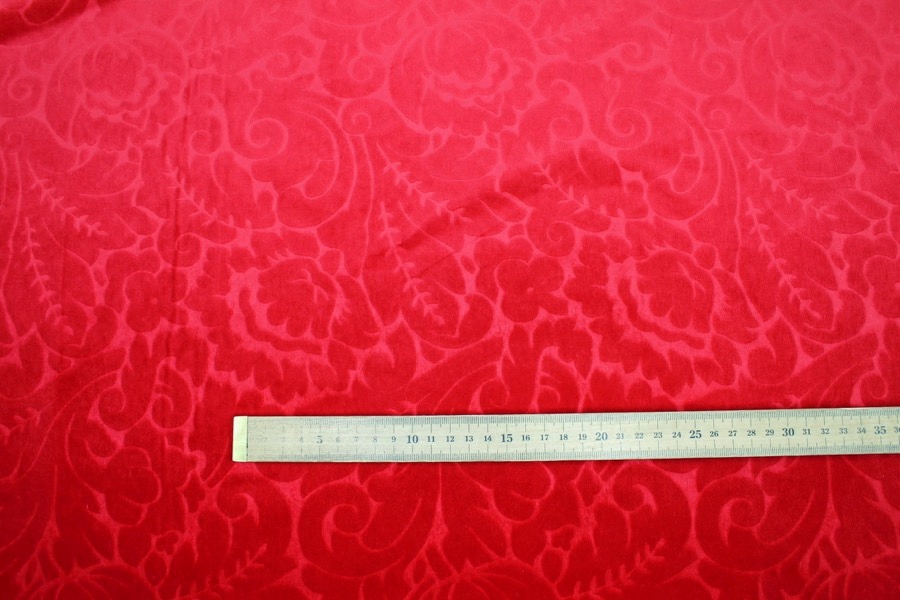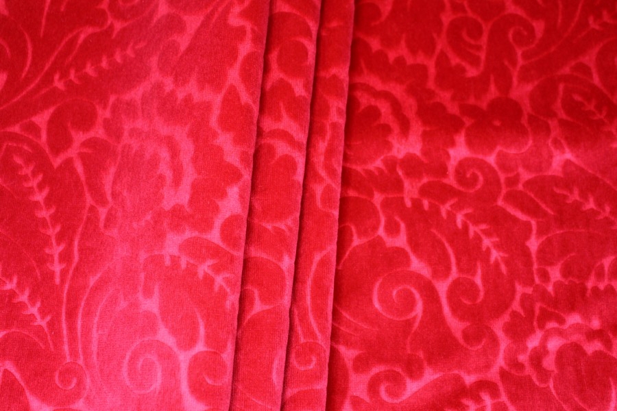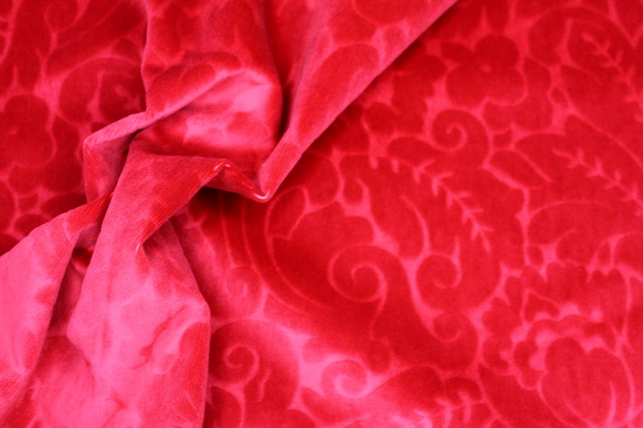 A luxurious 100% cotton velvet in red with a detailed embossed pattern.