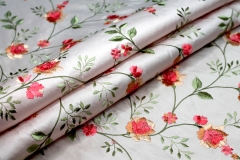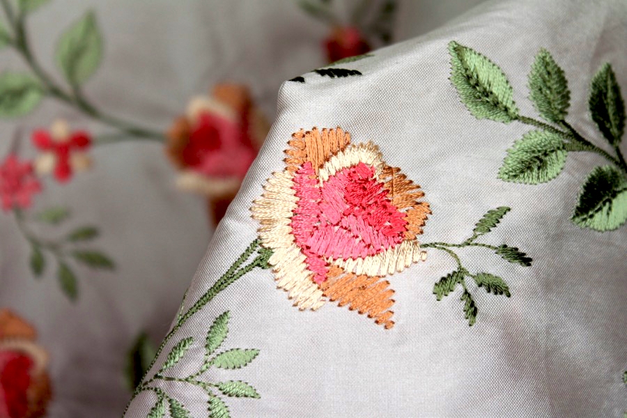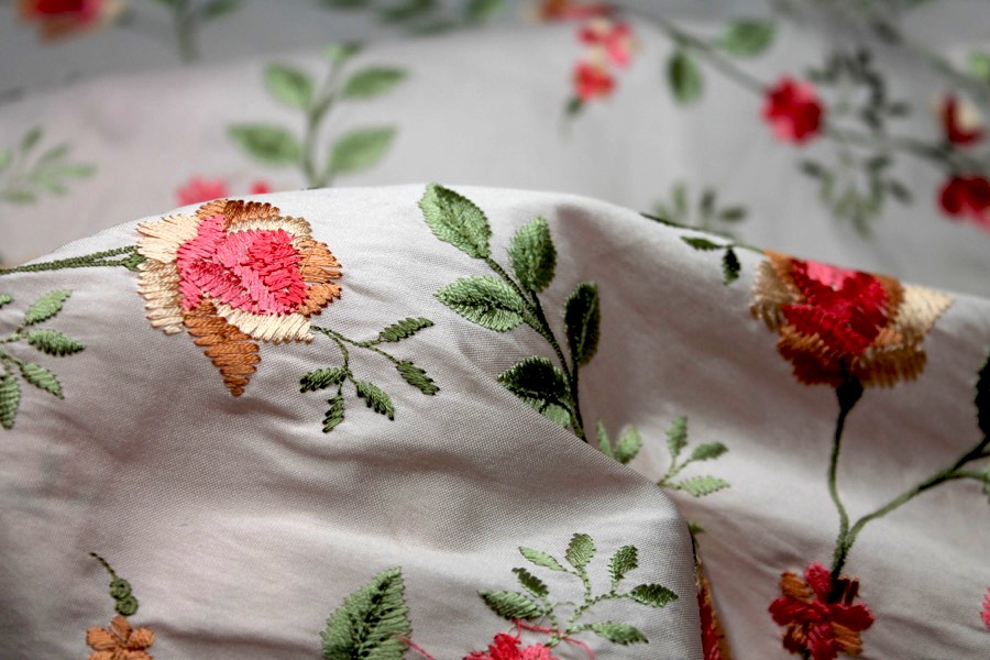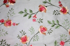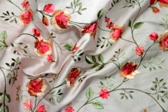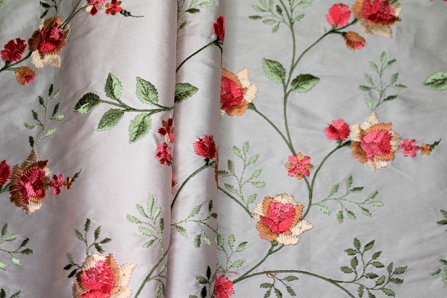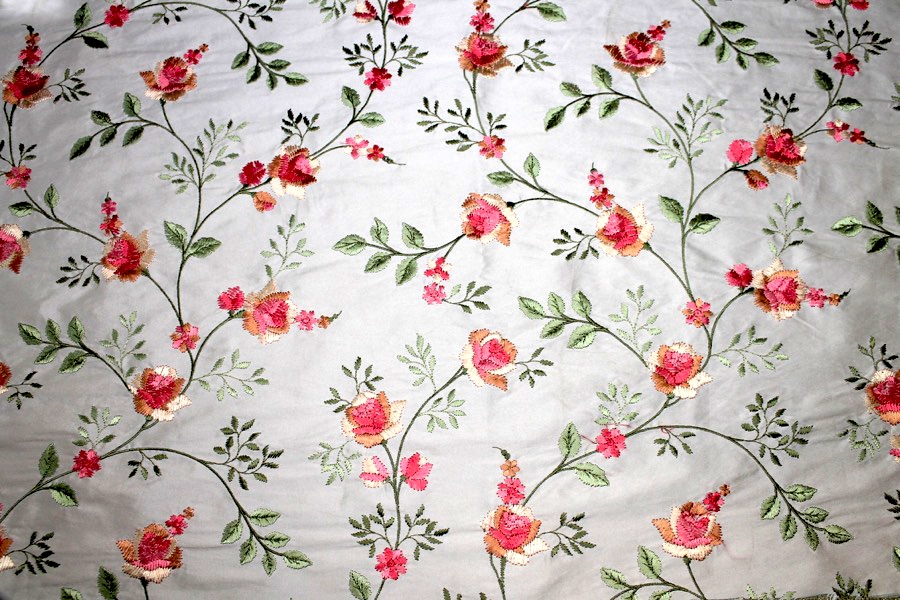 A polyester dupion base in a pale pink, embroidered with a detailed floral pattern of roses and twigs in pink, blush, peach and pale green thread.