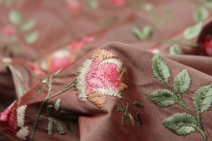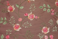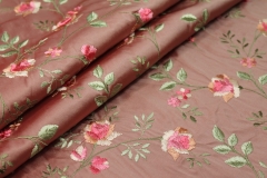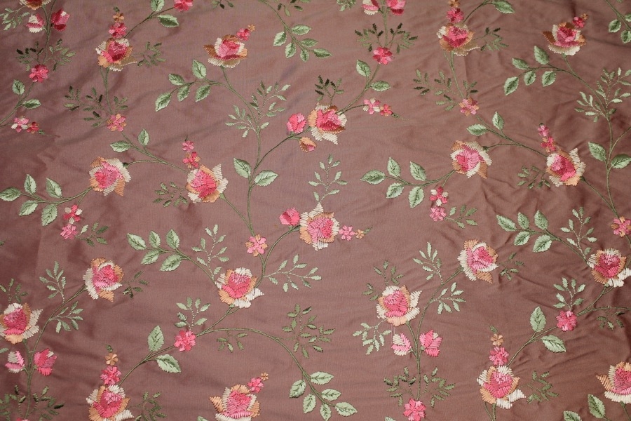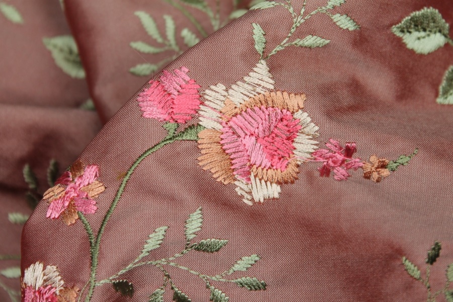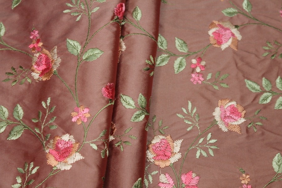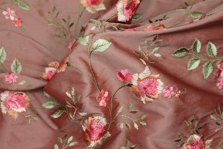 A polyester dupion base in tea rose, embroidered with a detailed floral pattern of roses and twigs in pinks and green thread.