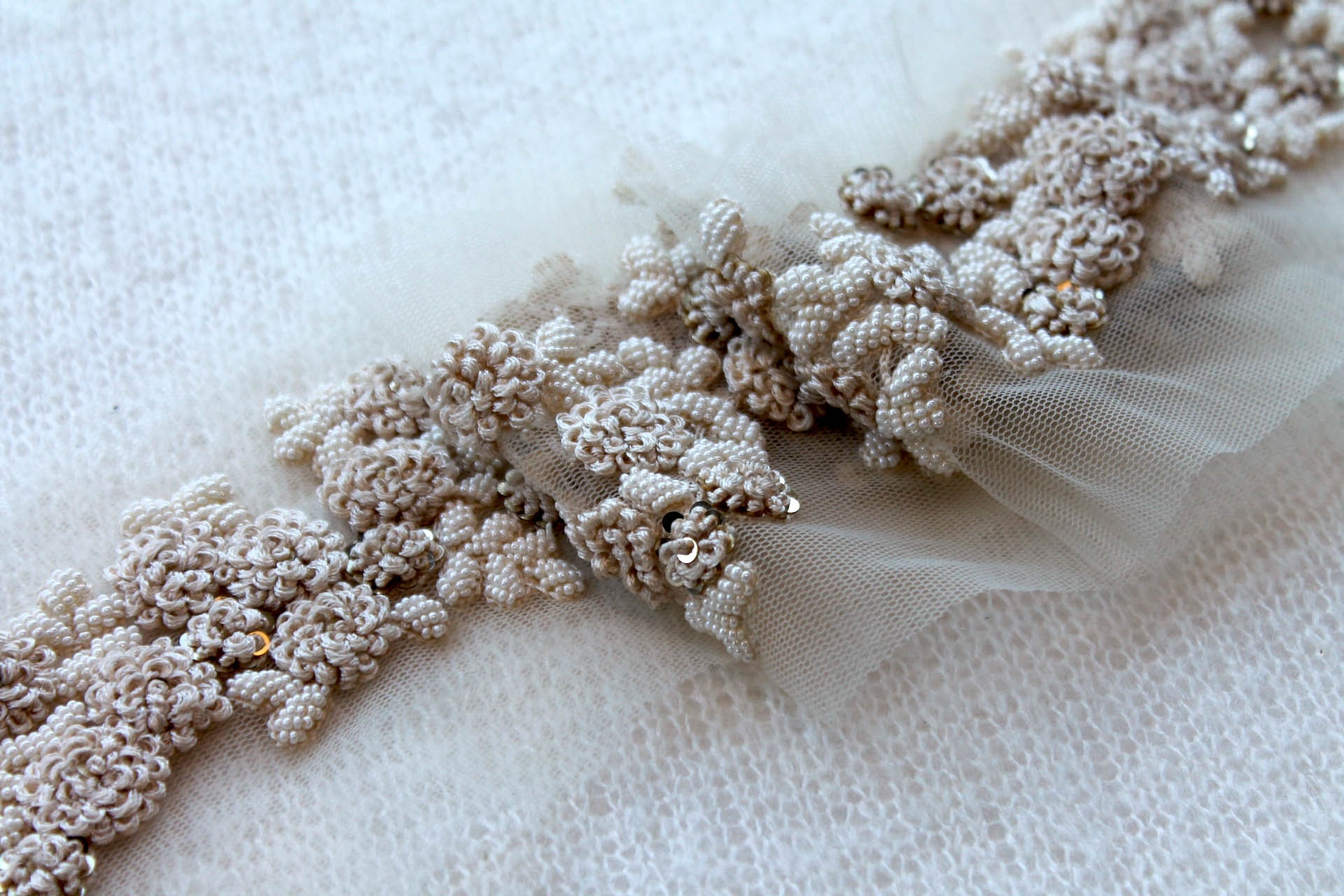 A pretty cream trim with a floral pattern in looped thread work embroidery and micro seed beads on cream tulle.