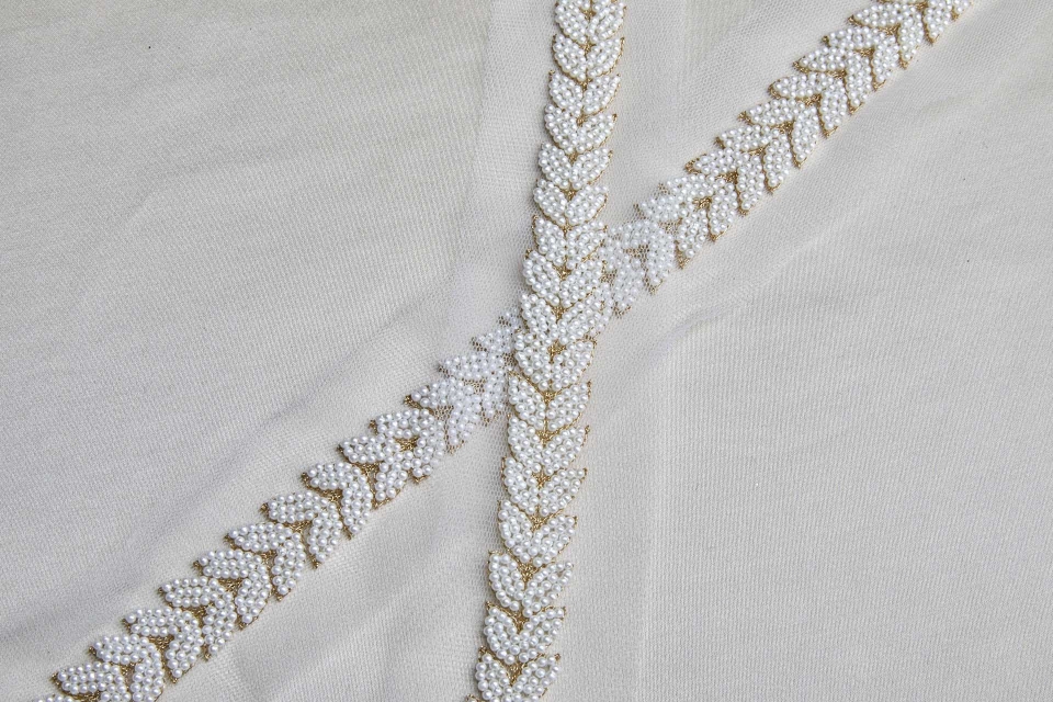 Embroidered Flowers and Micro Seed Beads Trim - Cream/Ecru