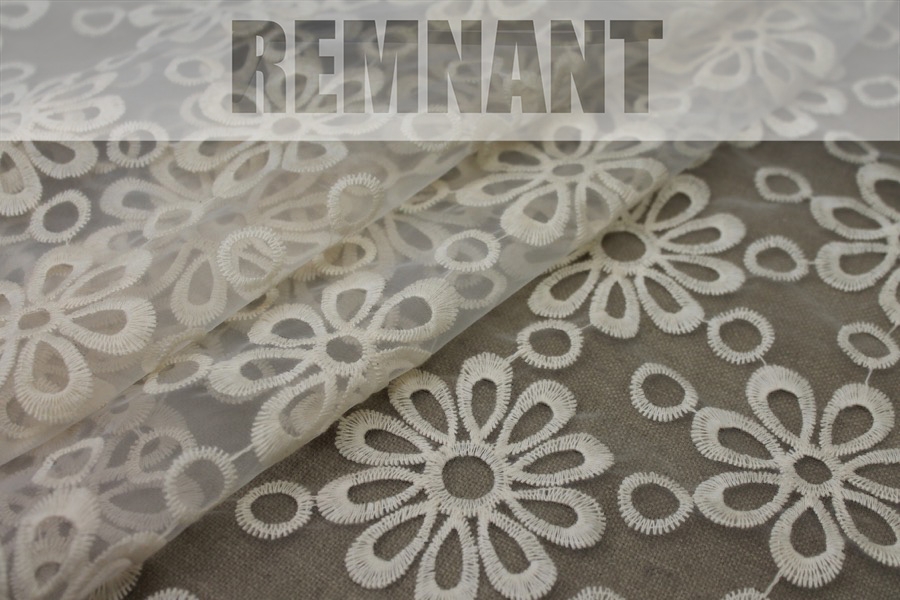 This is a remnant piece of a synthetic organza in ivory that has been embroidered with a floral pattern in ivory, with 3D stamen in the centres. 140cm wide.