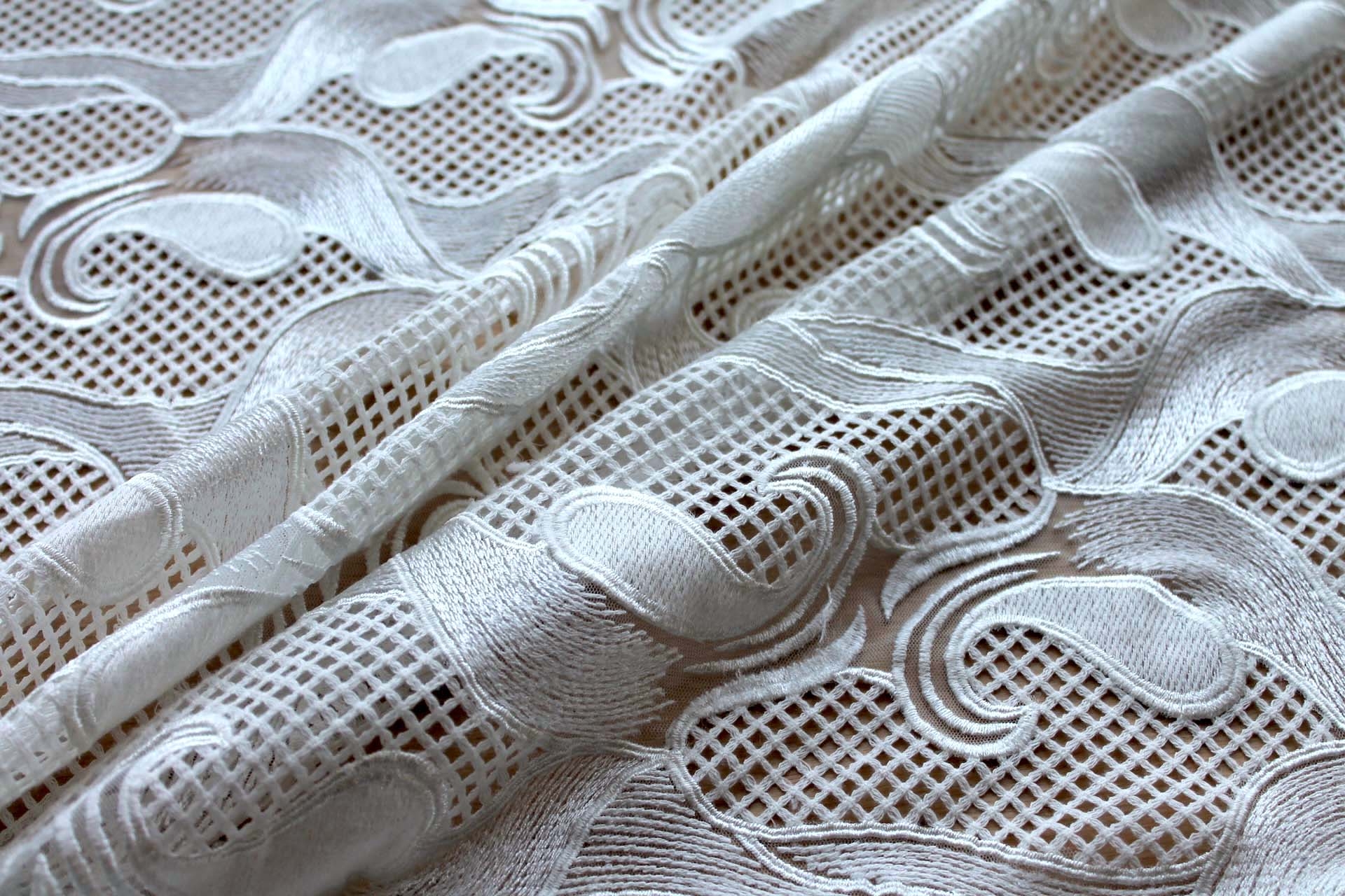A sheer tulle base embroidered with a contemporary artistic pattern in ivory. Funky and fun, perfect for a little jacket or for overlaying on a colour.