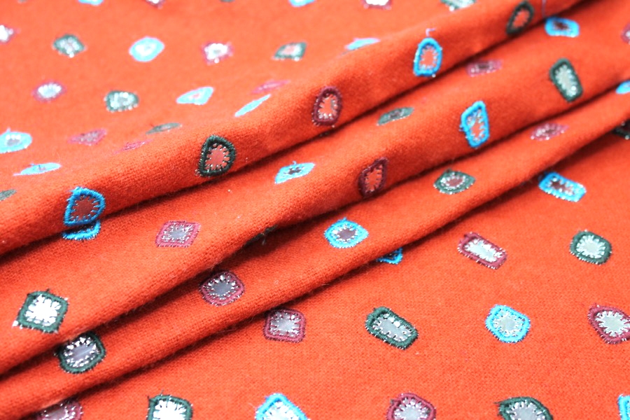 This is a woven 100% wool fabric in orange, with small square mirror like patches of silver vinyl fabric sewn on with grey, turquoise and burgundy thread..