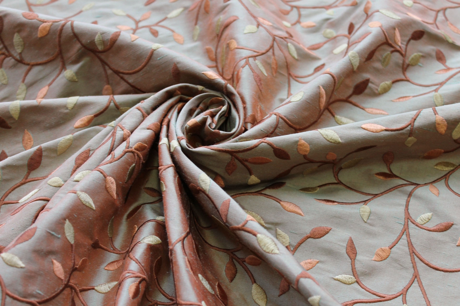A silk dupion base in a lovely shot shade of burnt orange and green, embroidered with a leaf and vine pattern in brown, copper and gold (non-metallic) thread. 100% silk.