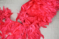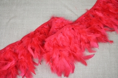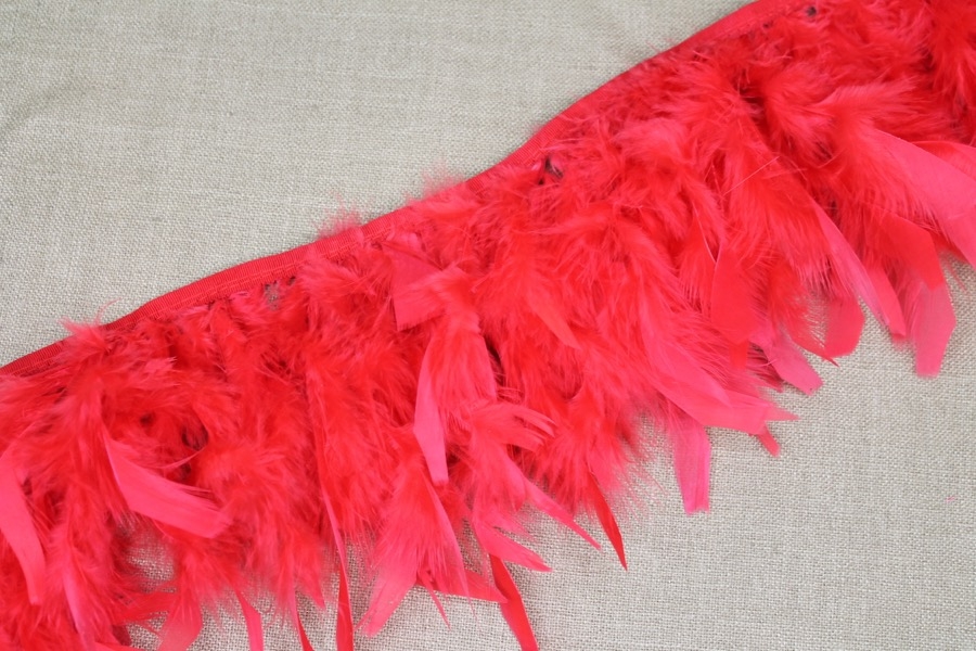 This is a decorative feather trim in red. The longest feathers measure approximately 15-18cm, but most are approximately 10-12cm.