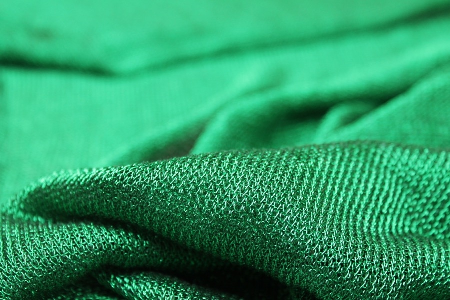 This is a soft fine knit in a green metallic thread. Great drape and bounce.
