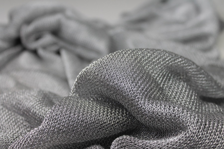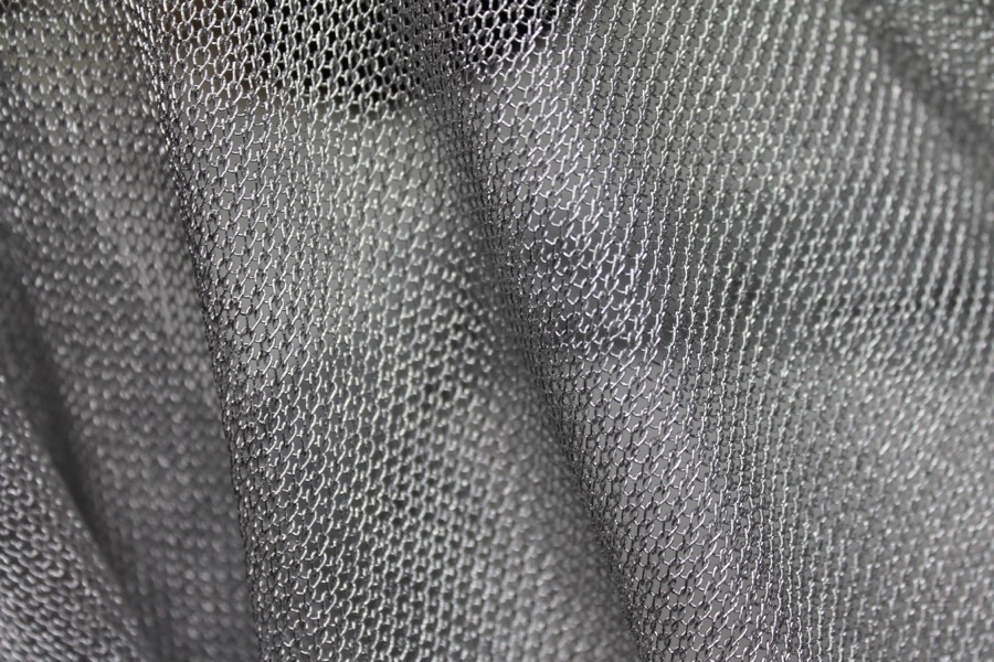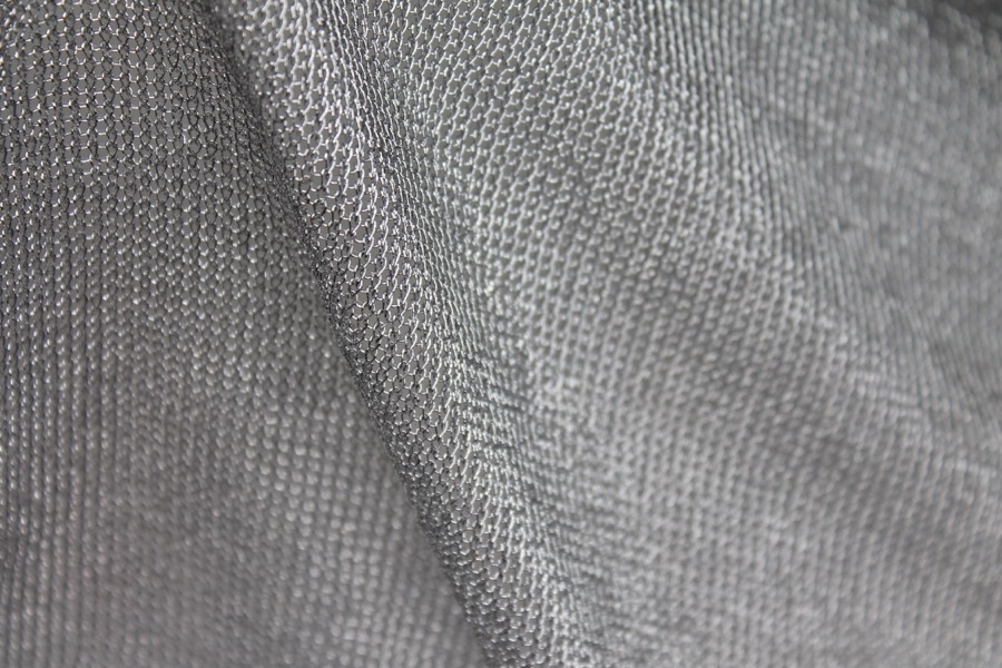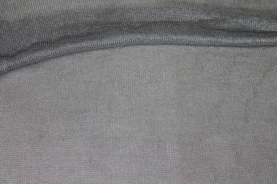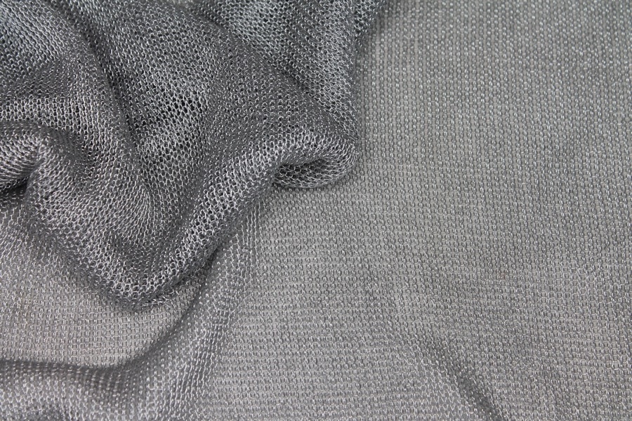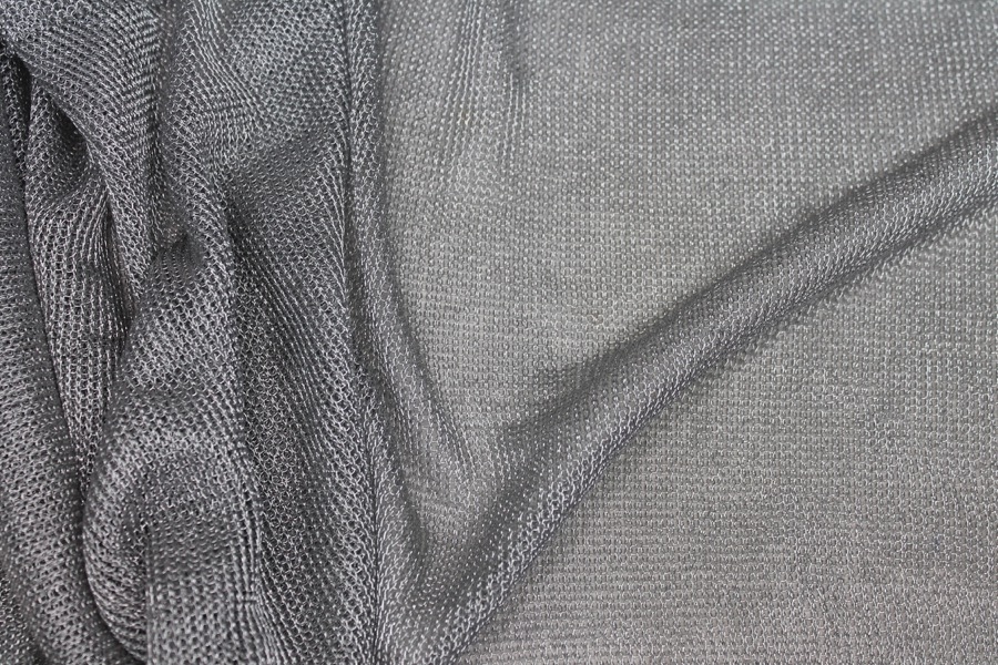 This is a soft fine knit in a silver metallic thread. Great drape and bounce.